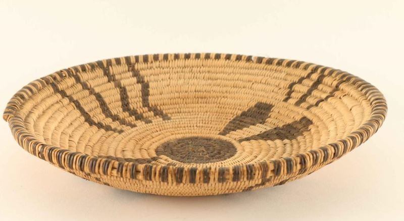Shallow bowl basket with black lightning design and variegated rim. Measures 8 3/4"x1 1/2". Good condition.