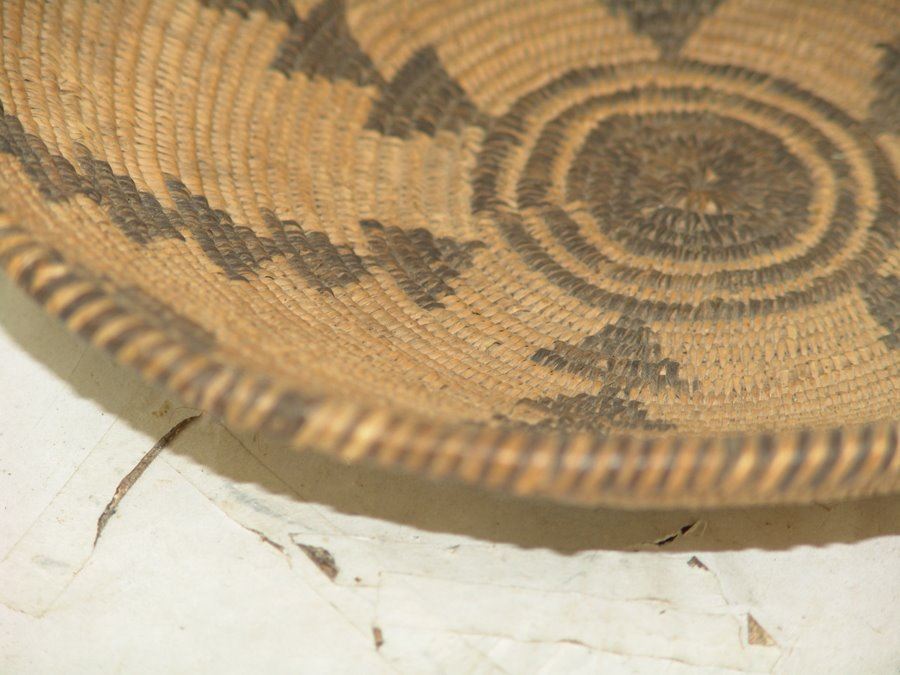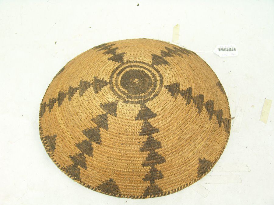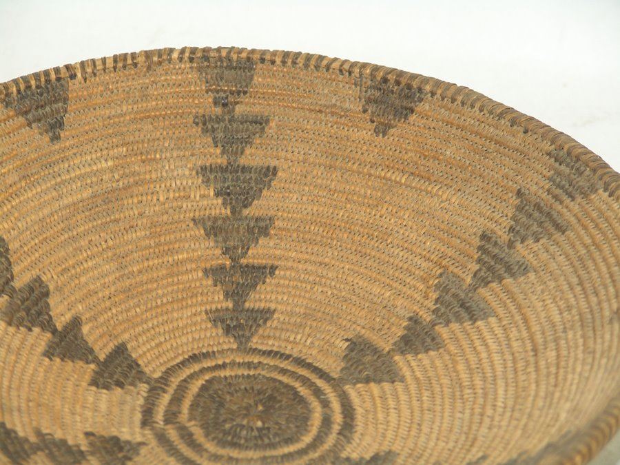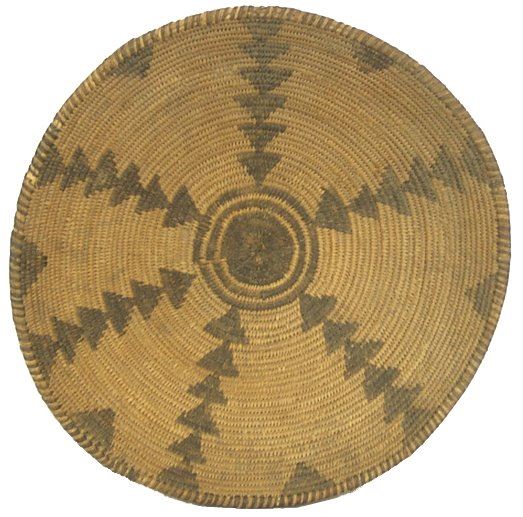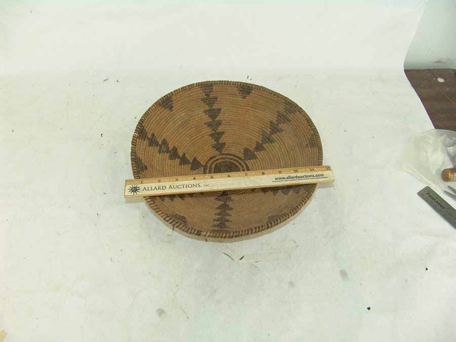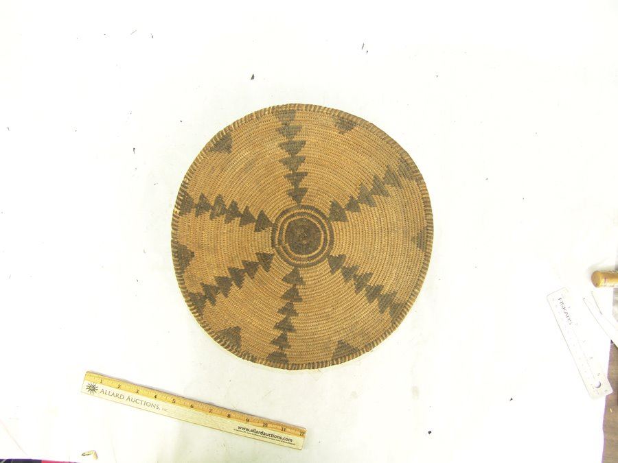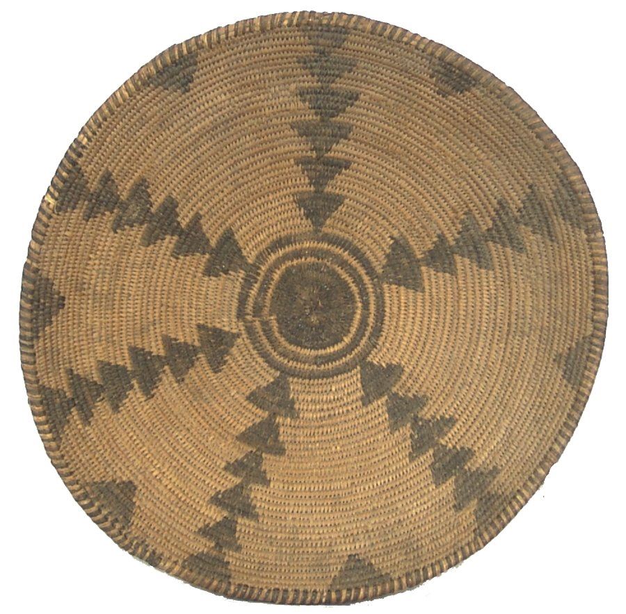 Early flared tray with black center and columns of stacked arrow points hanging from the rim. Good condition, shows use. Very minor stitch loss/damage.,,12" x 2-1/2"
