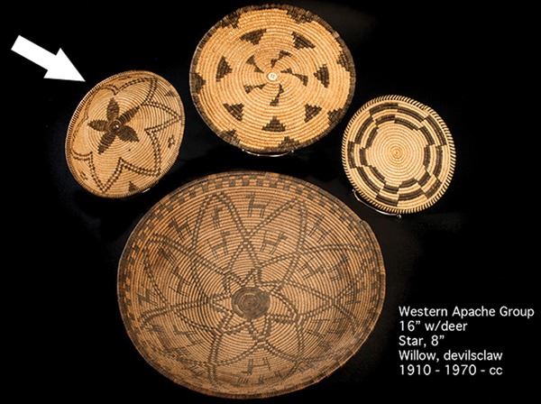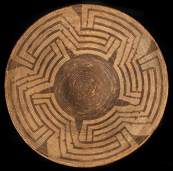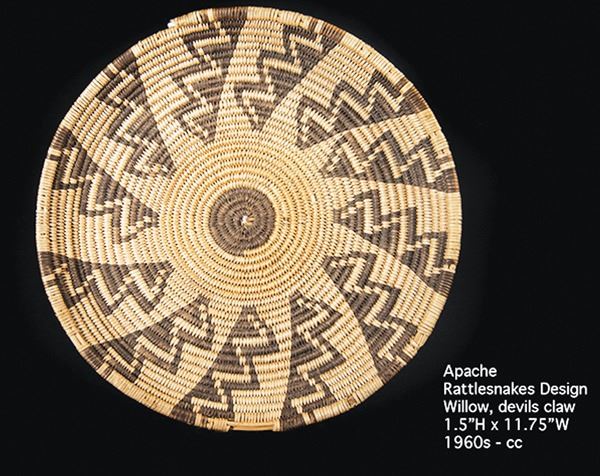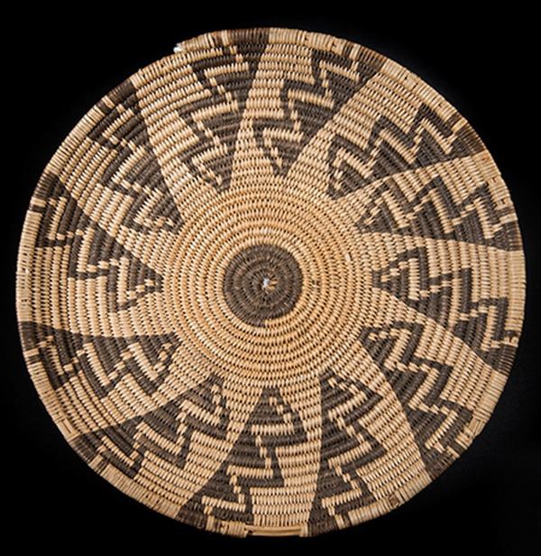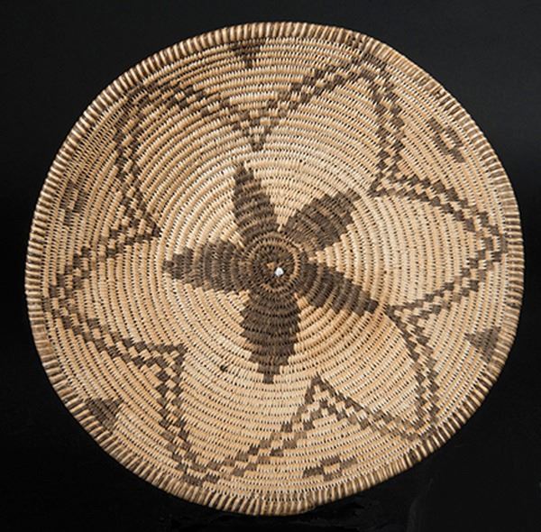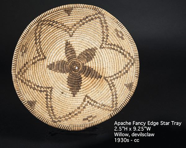 Small, finely woven tray with blossom design, crosses and arrow points, and fully ticked rim. Very good condition, some fading.Ca.1930s2-1/4" x 9"