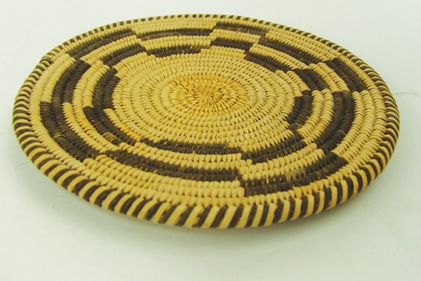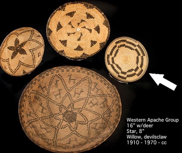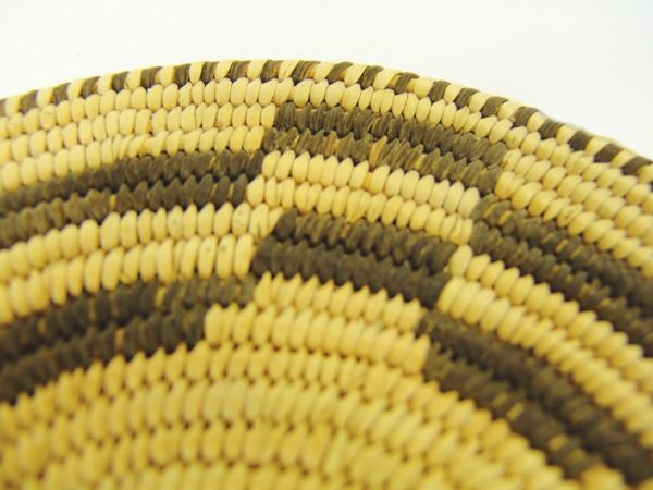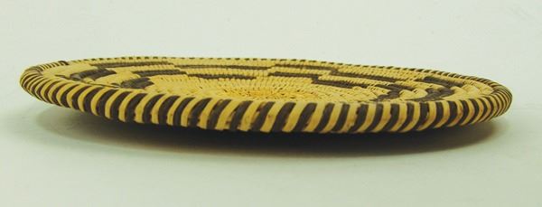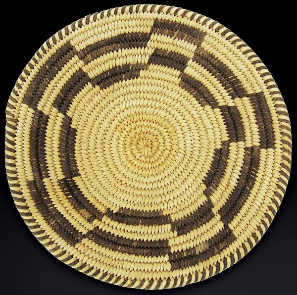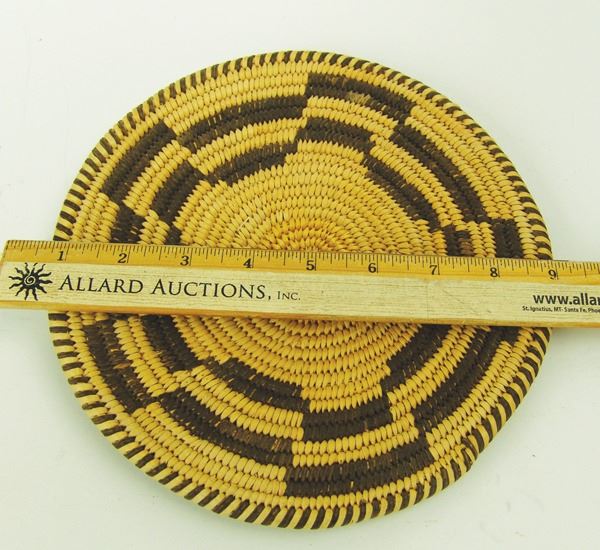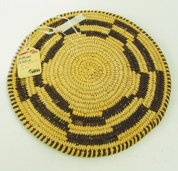Beautiful, Western Apache plaque with crisp geometrics and fully ticked rim, done in a finer weave. Very good condition.Ca. 1940s8-1/2"