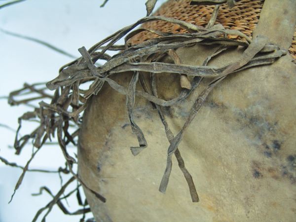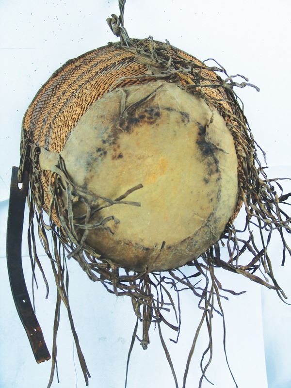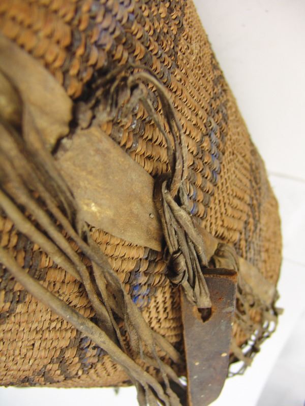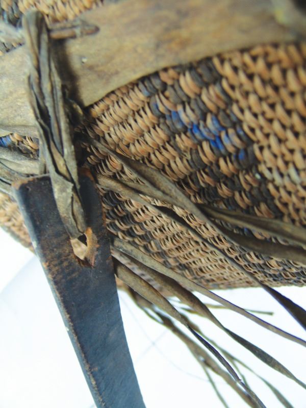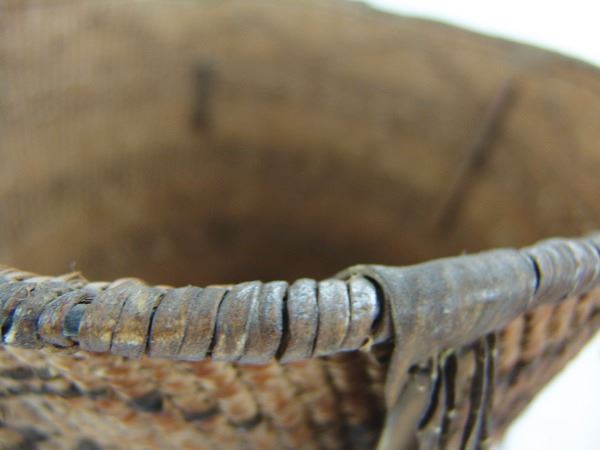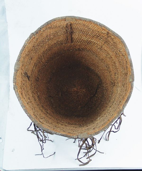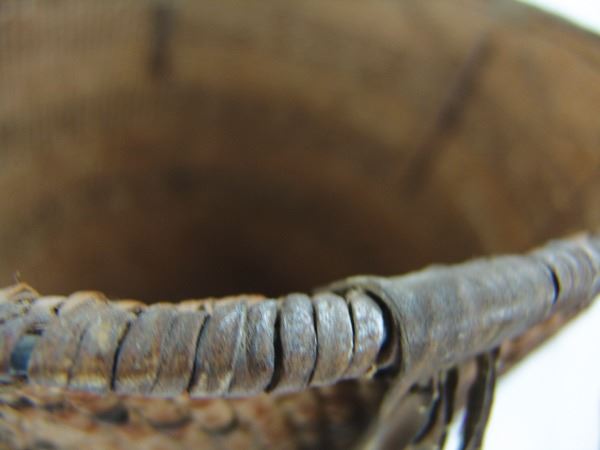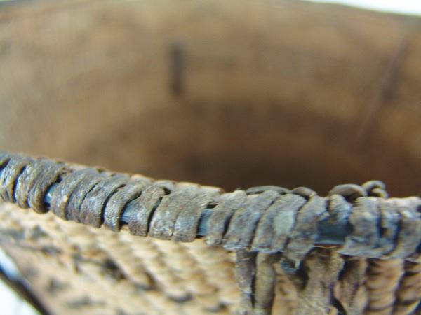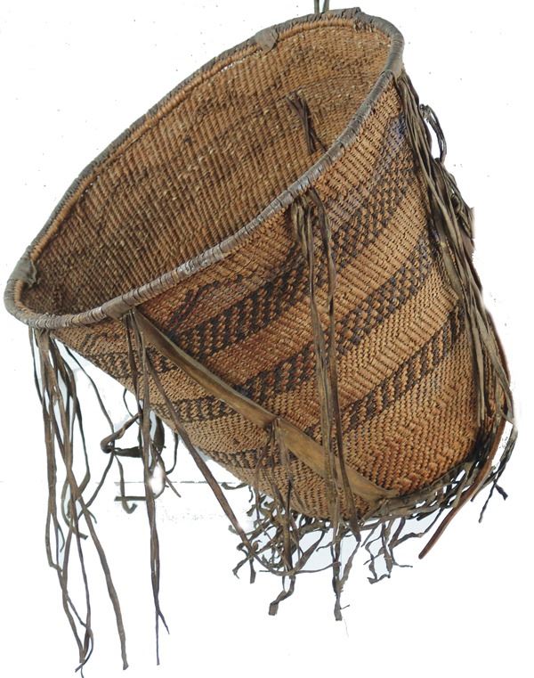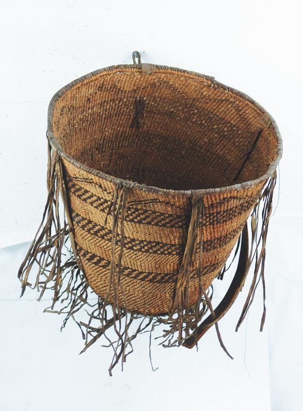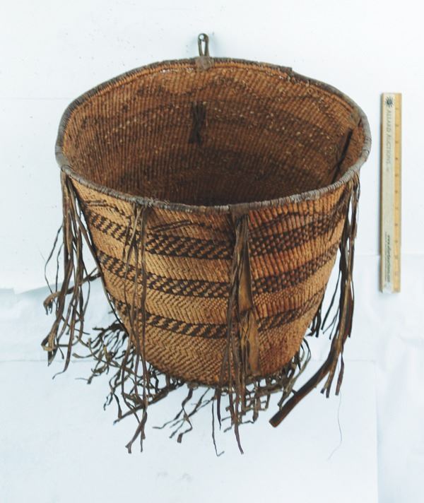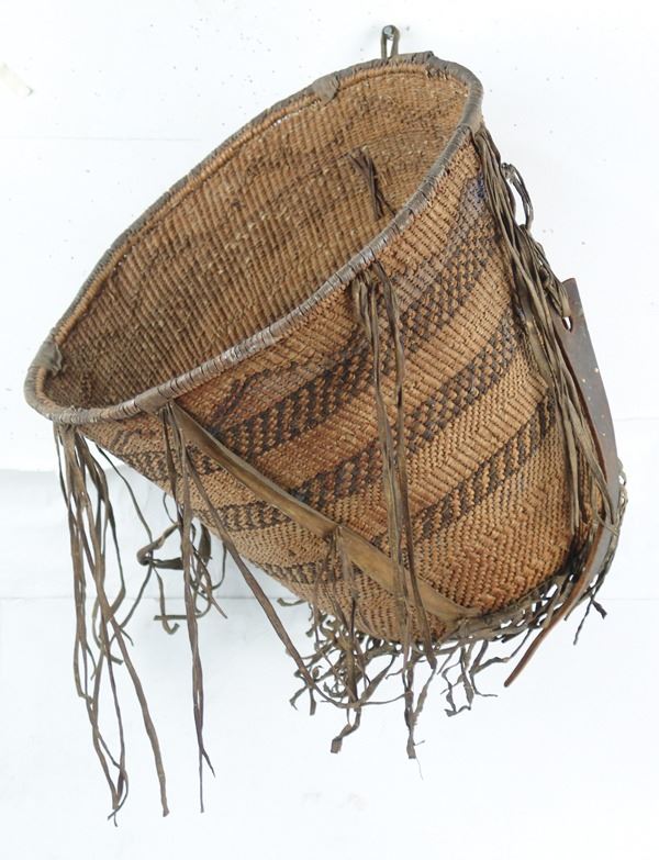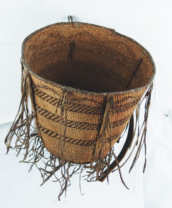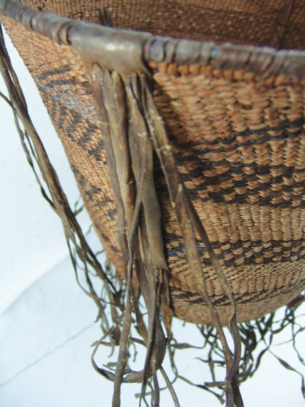 Large, early, twined-weave conical burden basket with geometric bands, and traditional rawhide/buckskin trim. Good condition. A nice, large, early example.Early 1900s15" x 17"