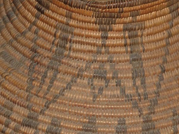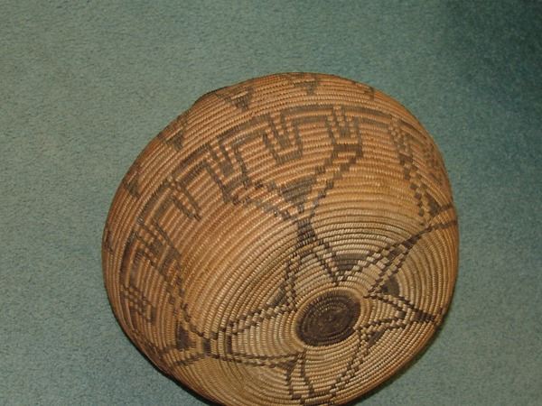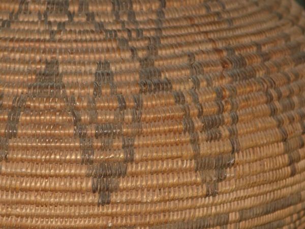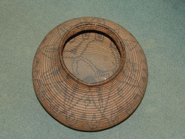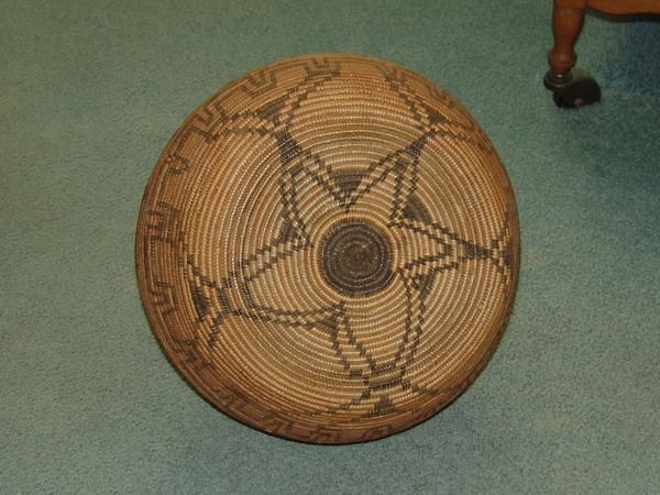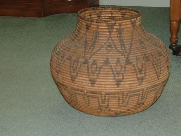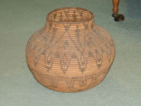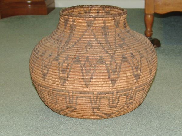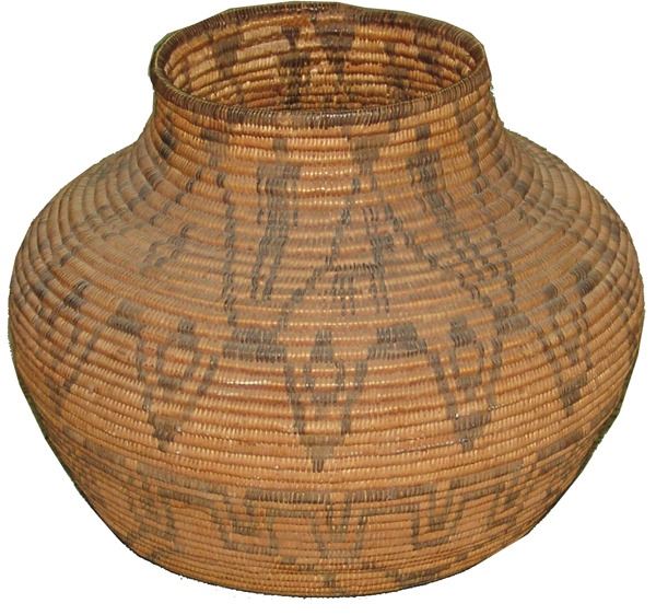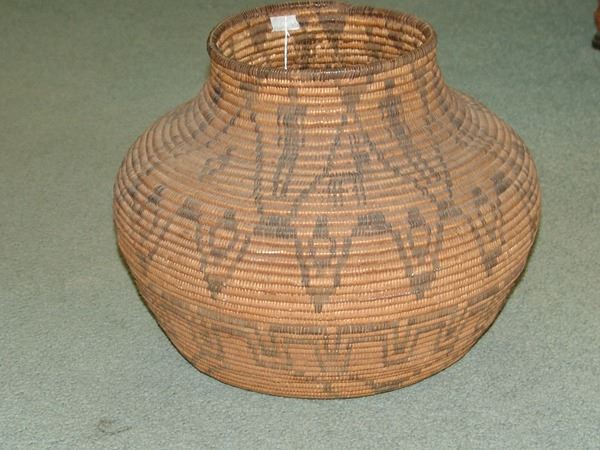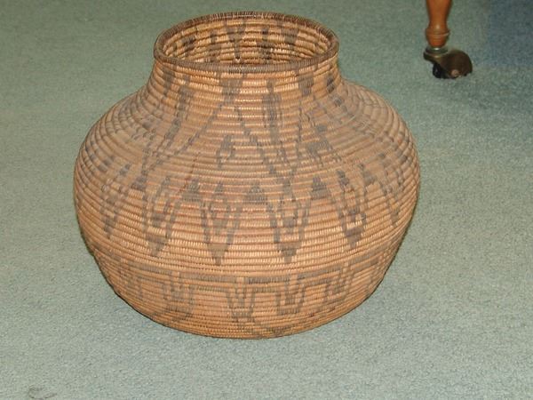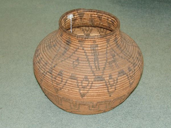 Beautiful and amazing, large, woven basketry olla with elongated human figures around the rim, incorporated diamond figures, key type geometrics and star/blossom bottom. Very good condition, minor fading. Ex. Mark Wald Collection.