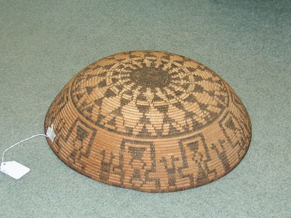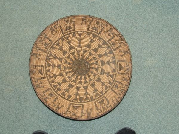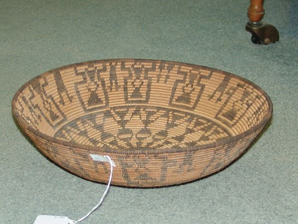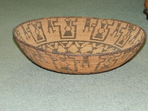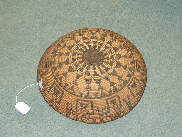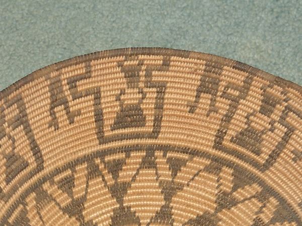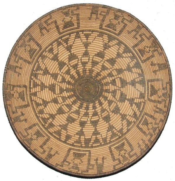 Amazing, classic, tightly woven basketry tray loaded with human and animal figures, and other unique and interesting geometric symbols. Near mint condition. Ex. Mark Wald Collection.