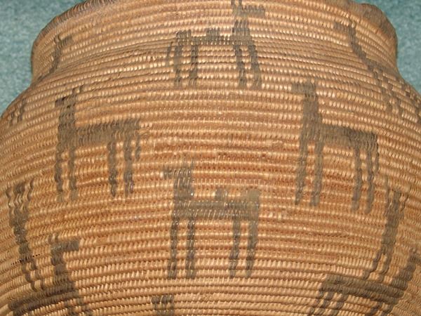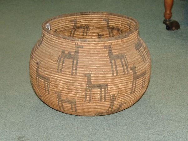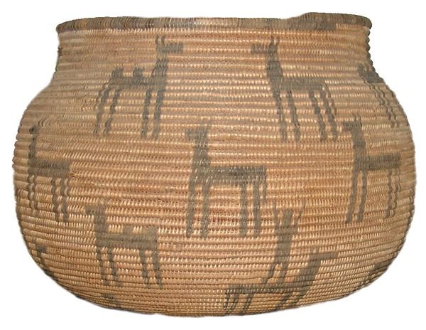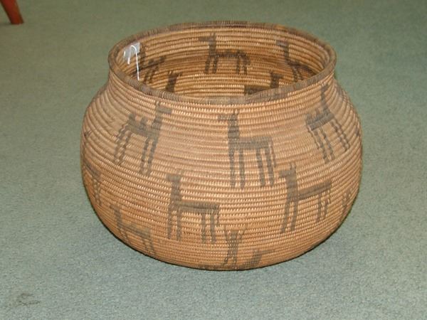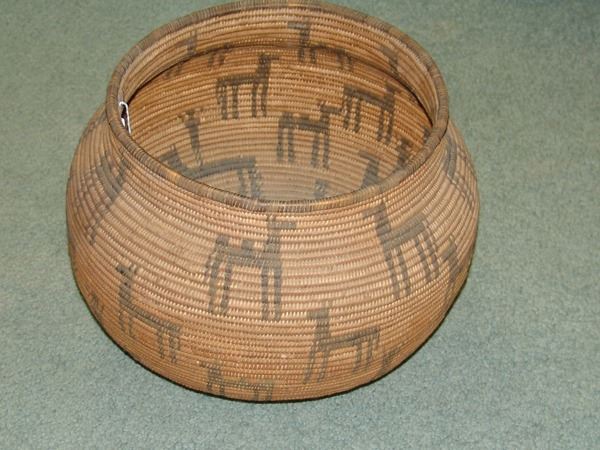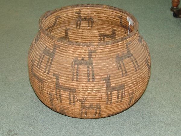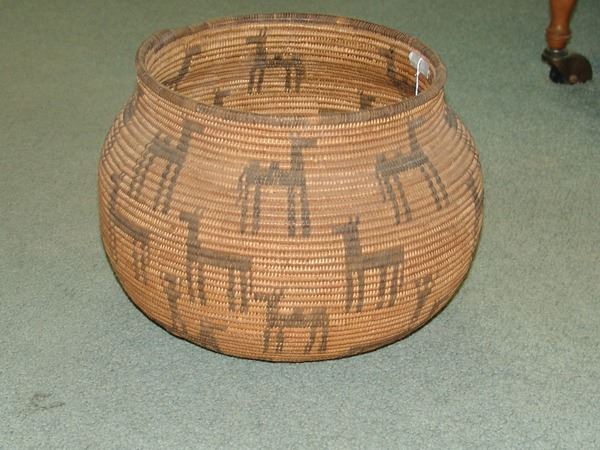 Outstanding, globular shaped, wide mouthed olla loaded with circus figures including camels and horses, and trick riders standing on horses. An amazing work of art! Very good condition. Ex. Mark Wald Collection.