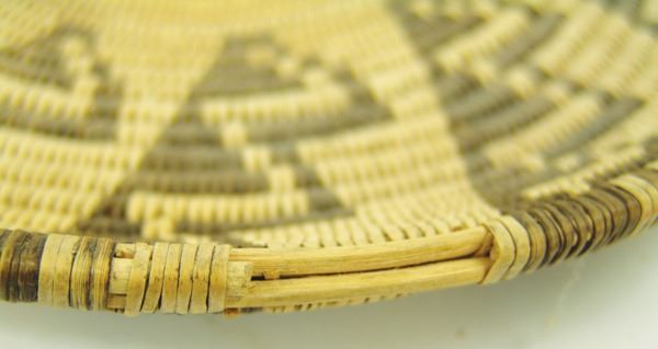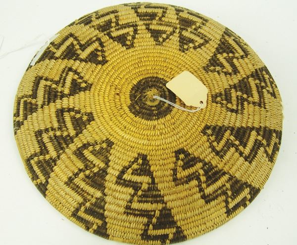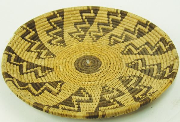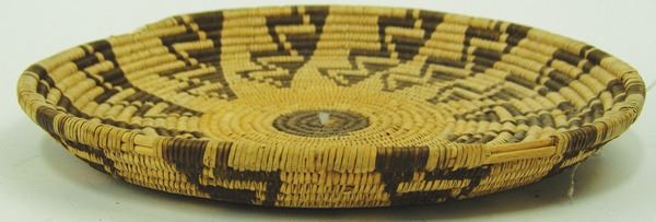 Ca.1940s 1-3/4" x 12" Unique, Yavapai Apache tray with radiating, stepped geometric devices surrounding a black center start. Very good condition.