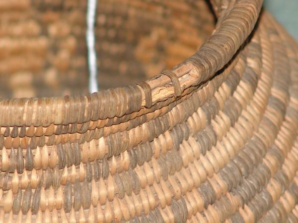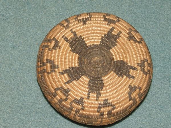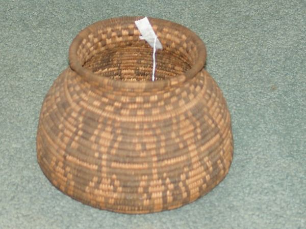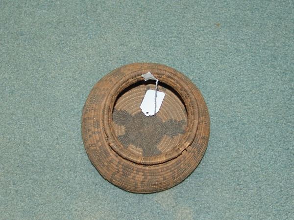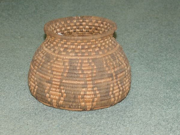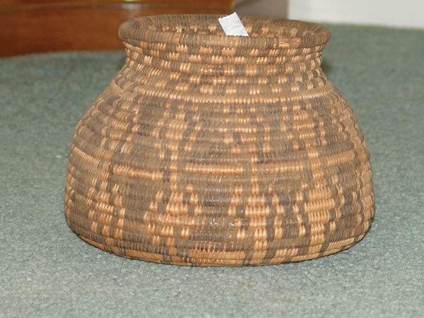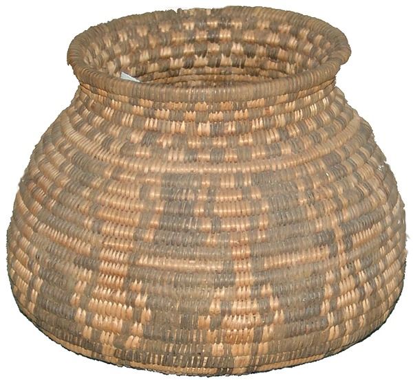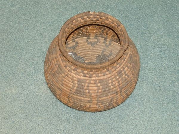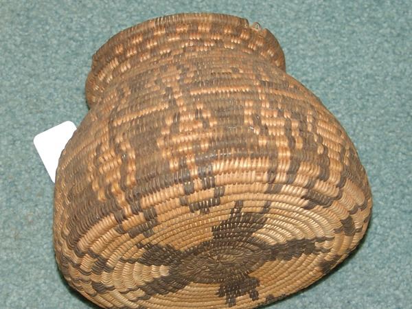 Smaller, unique shaped basketry olla with rattlesnake symbols done vertically on the sides, plus five snake heads protruding from the bottom. Very good condition, a few missing rim stitches. Ex. Mark Wald Collection.