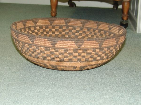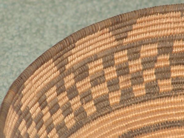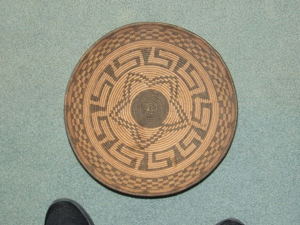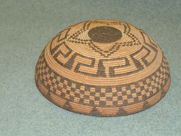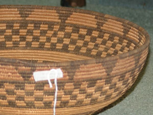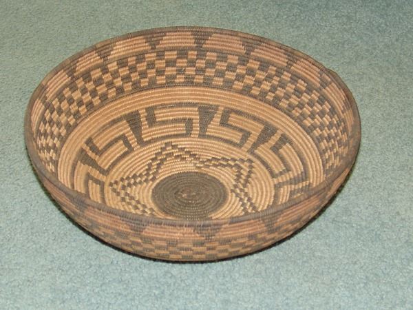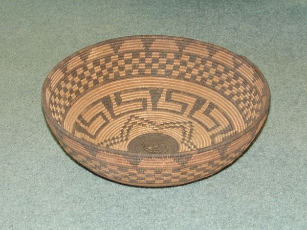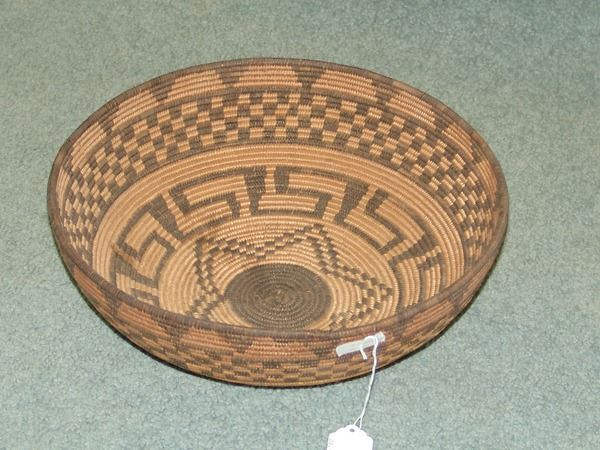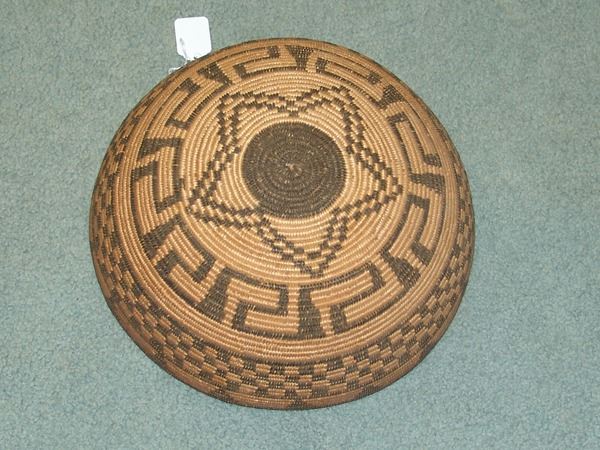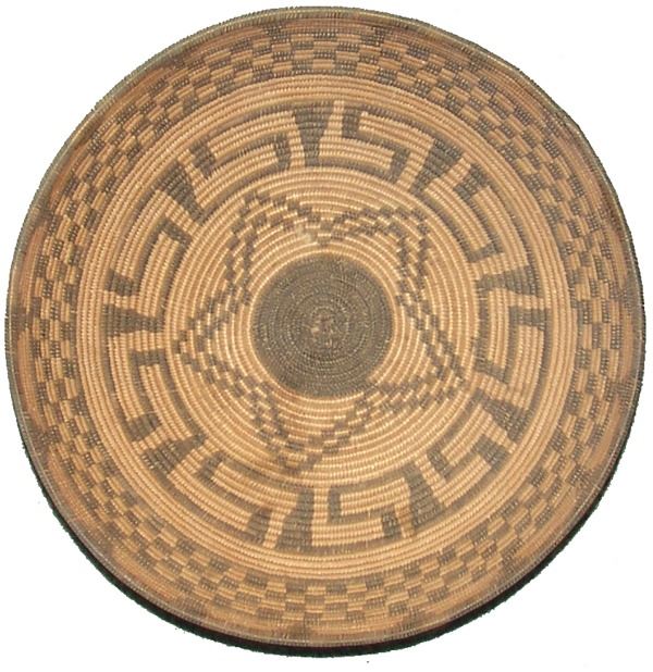 Outstanding, deep, rounded basketry bowl/tray with black star center, a row of key-type figures, wide checkered band, and down pointing rim points. Very good condition. Museum quality. Ex. Mark Wald Collection.