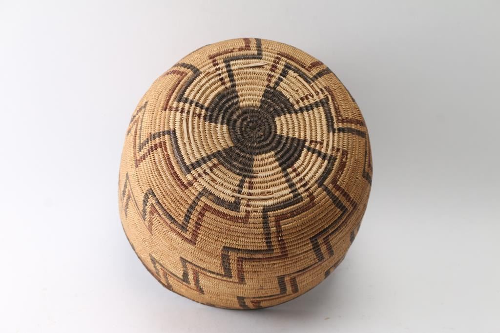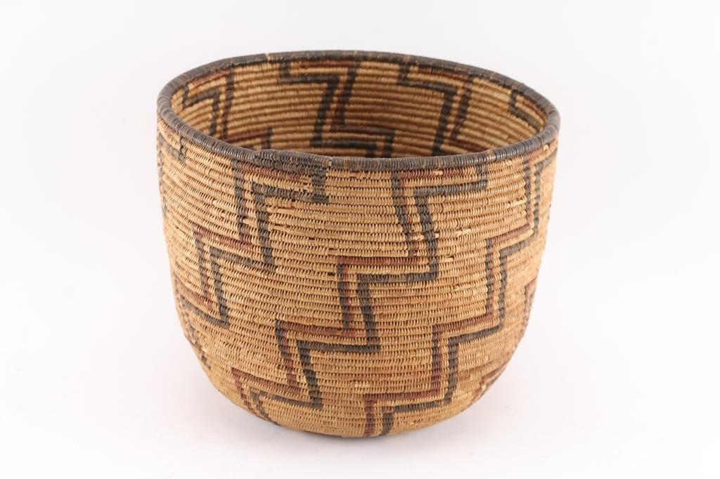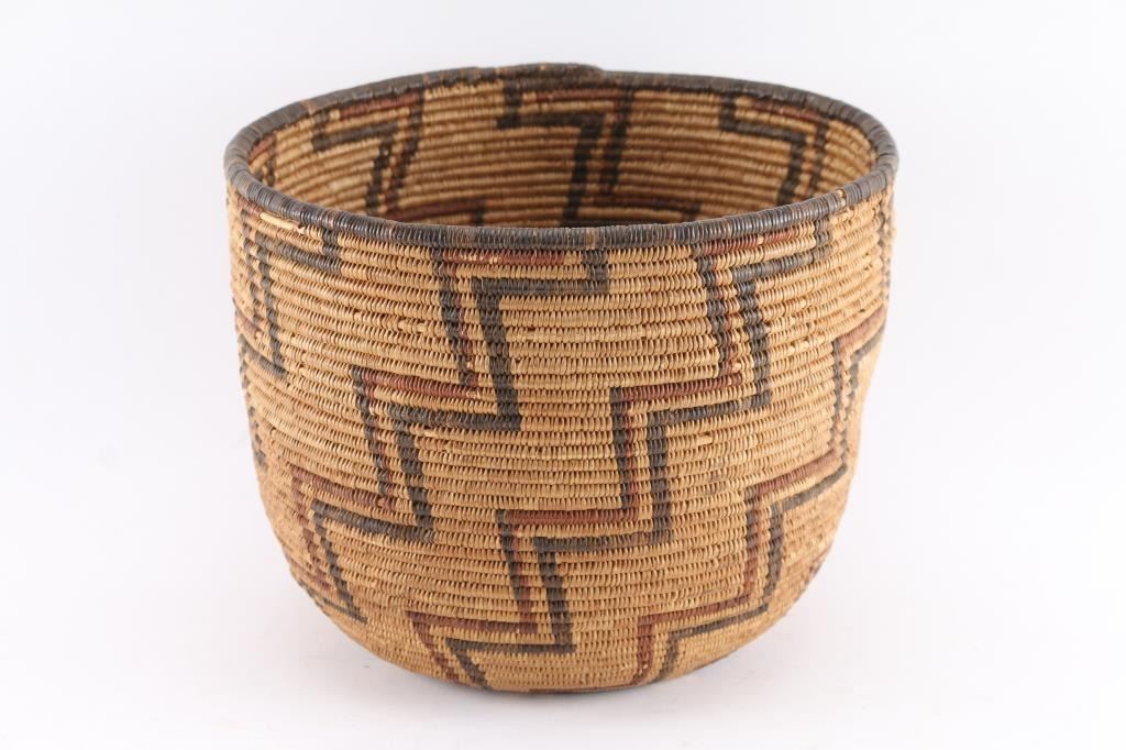 With two tone stair step design in a cylindricle shape. 8" tall, 10" diameter. In fair to good condition. Scattered losses due to age. From the Steve Goldstein Collection, Scottsdale, AZ.