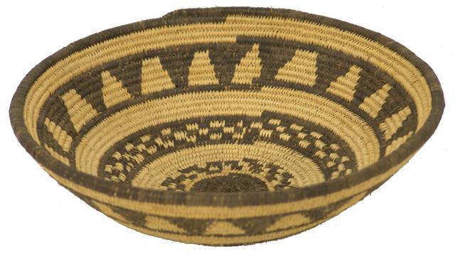 Circa 1930s, Well woven San Carlos version basket with black center and three-band design, one a rattlesnake; excellent condition. 3" x 10-3/4"