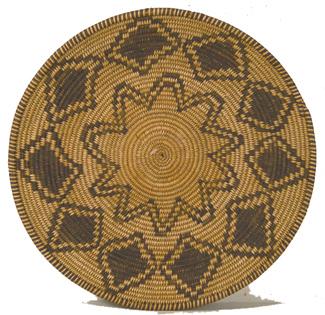 Beautiful woven basketry tray with striking diamond and blossom motif; excellent condition. 14-1/2"