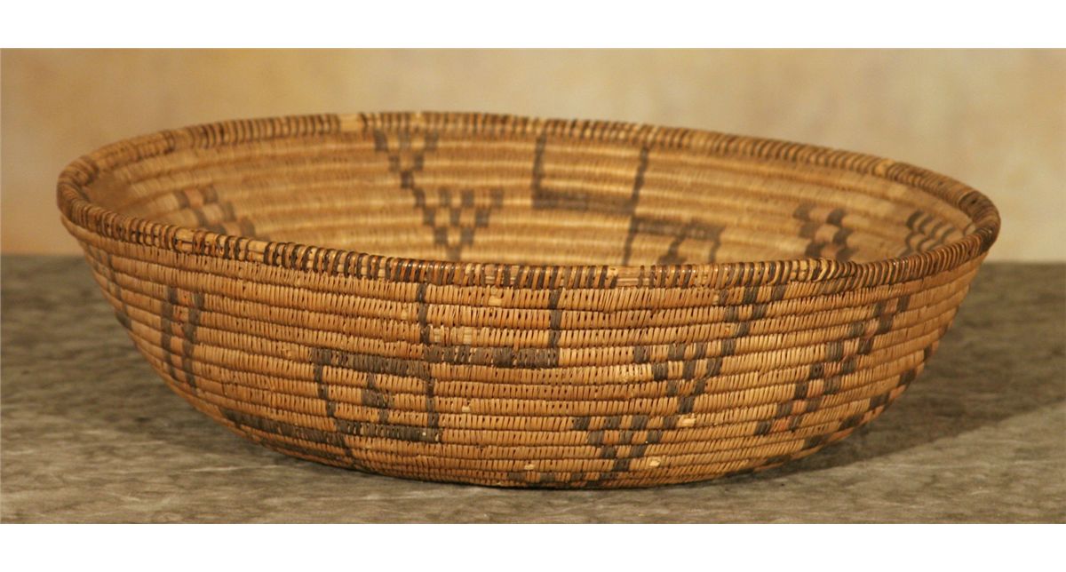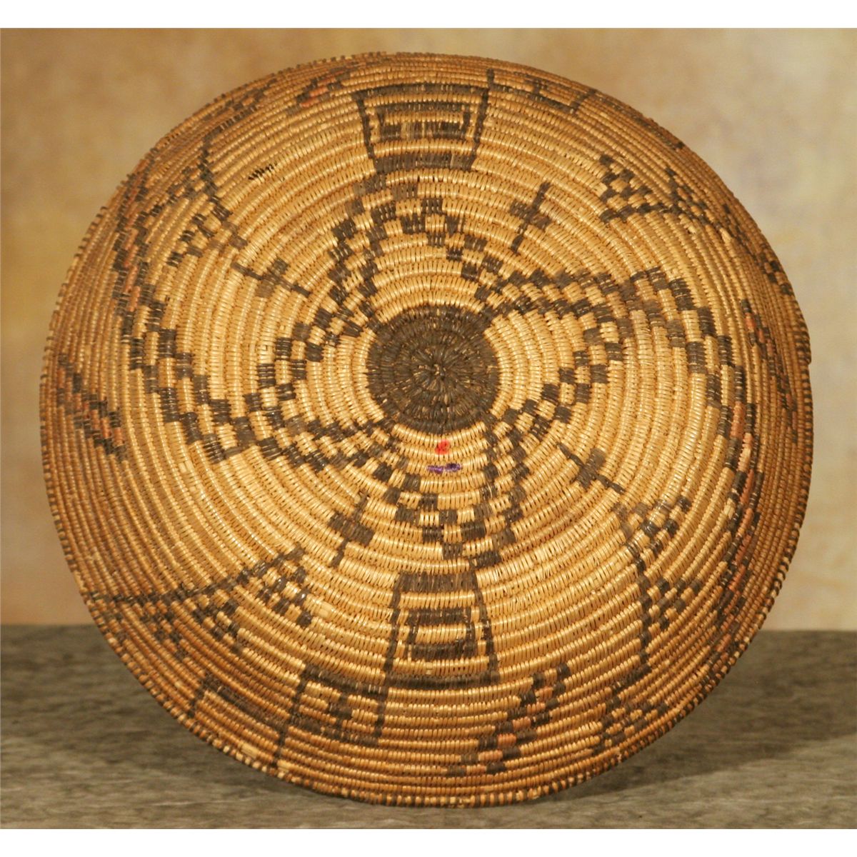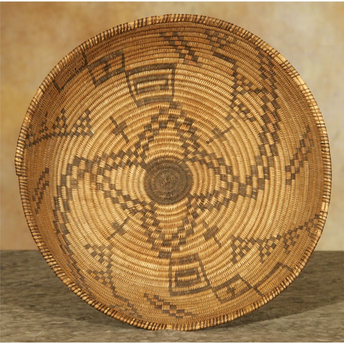 Apache Basketry Bowl. 13" diameter x 3.5" deep. Four petal design amongst various stepped and floating elements. Circa early 1900s.