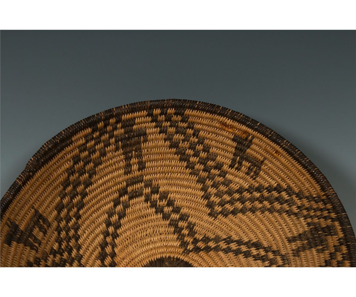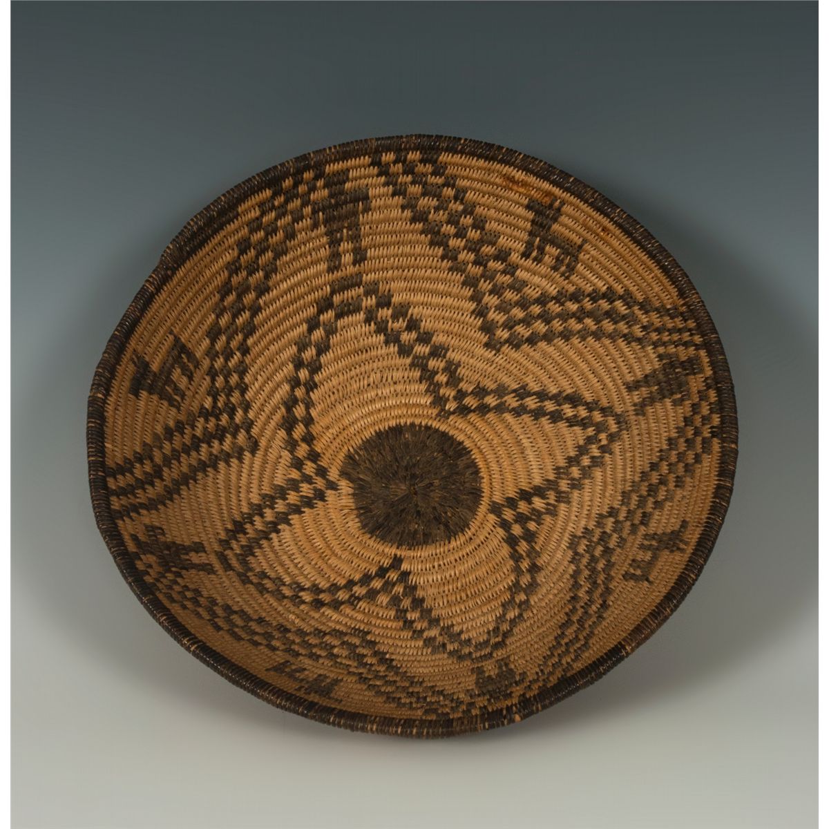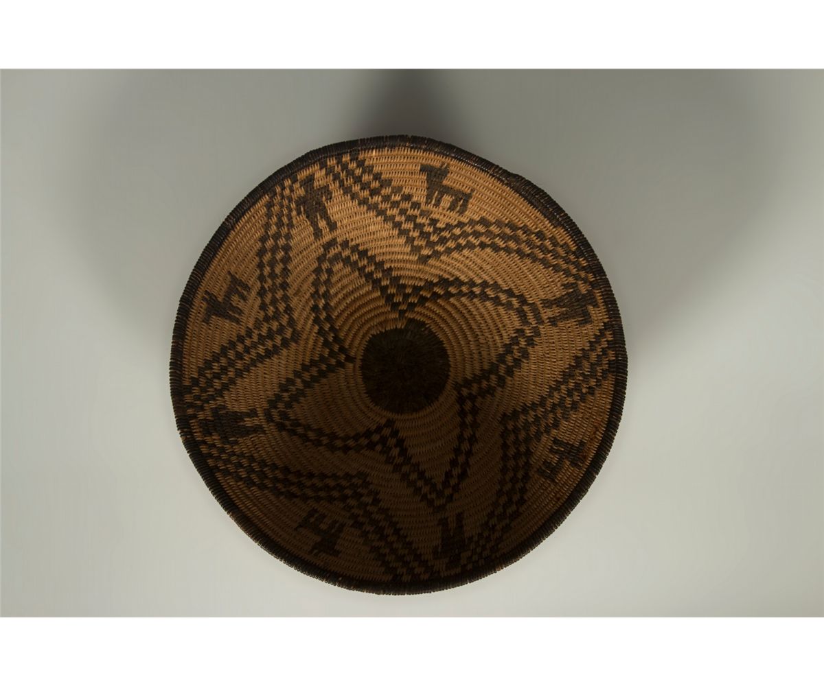 Apache Basketry Bowl. 9.75" diameter, 3.5" tall. Star design with alternating human and dog figures. Circa 1920s.
