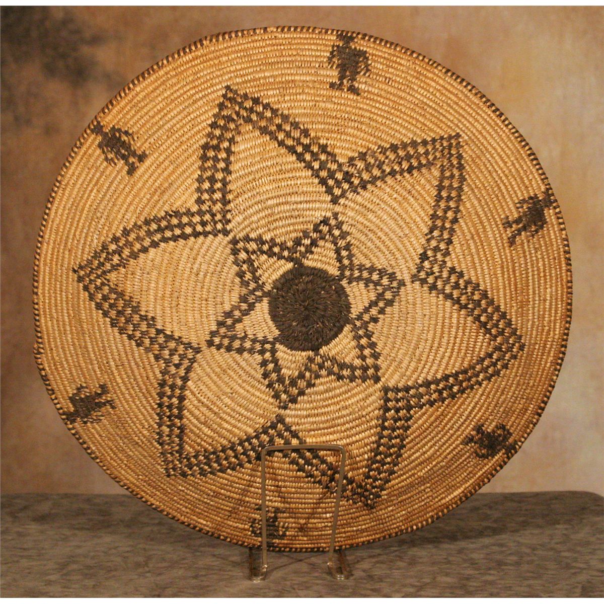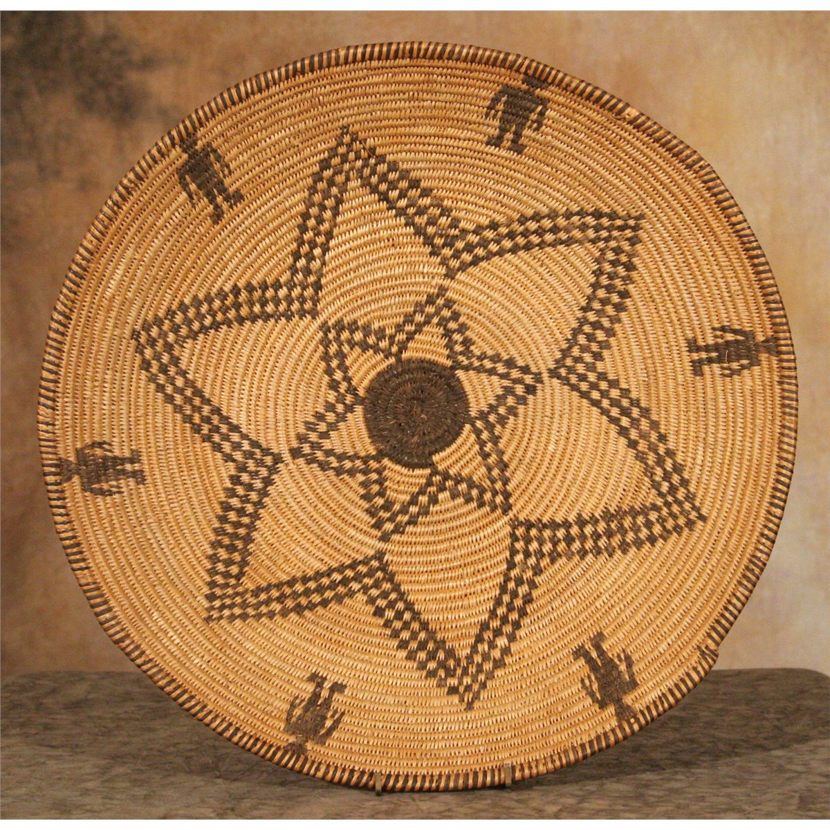 Apache Basketry Tray. 16.5" diameter. Classic pictorial tray depicting six human figures around a double star/blossom. Early 20th century.