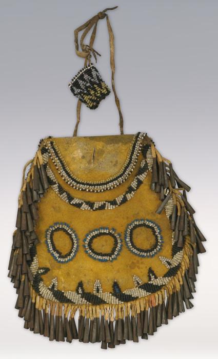 Apache Beaded Bag. 7" x 7". Ceremonial designs. Yellow ochre Indian tanned hide with tin cone decorations. 19th century. Condition Report: Tin cones are intact. Very minor bead loss on flap. Hide is discolored from age and use otherwise sound.