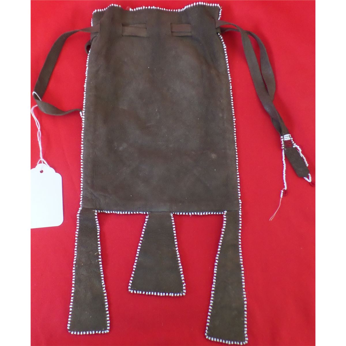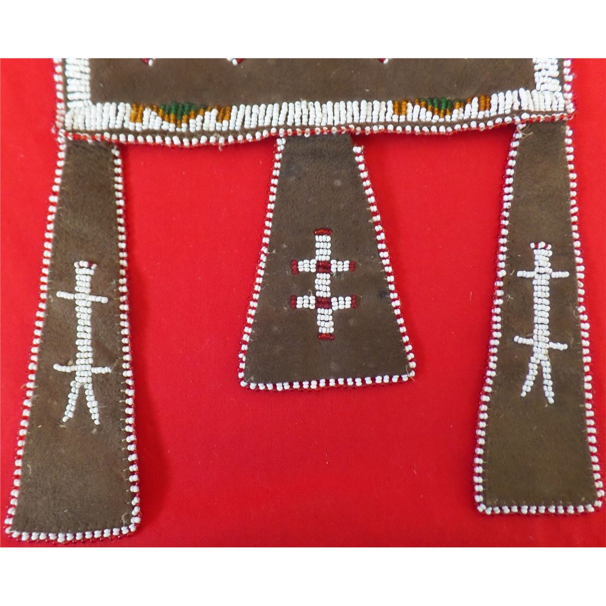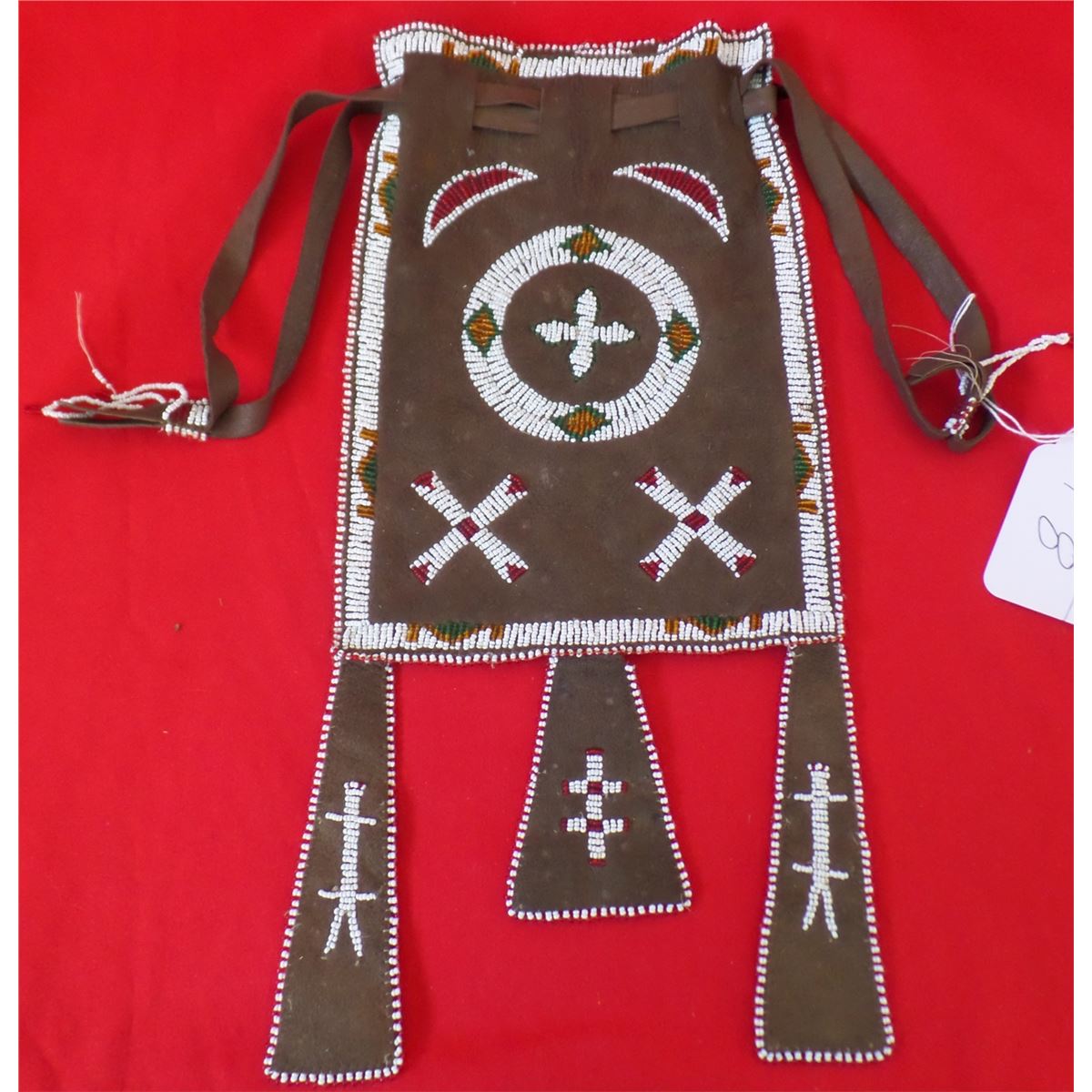 Apache Beaded Bag measuring 14 x 7 inches. There is slight bead loss, but overall bag is in good condition. There are animals on tabs, possibly lizards. Please look at pictures. Bag is made from cowhide and glass beads. Shipping $14.00o