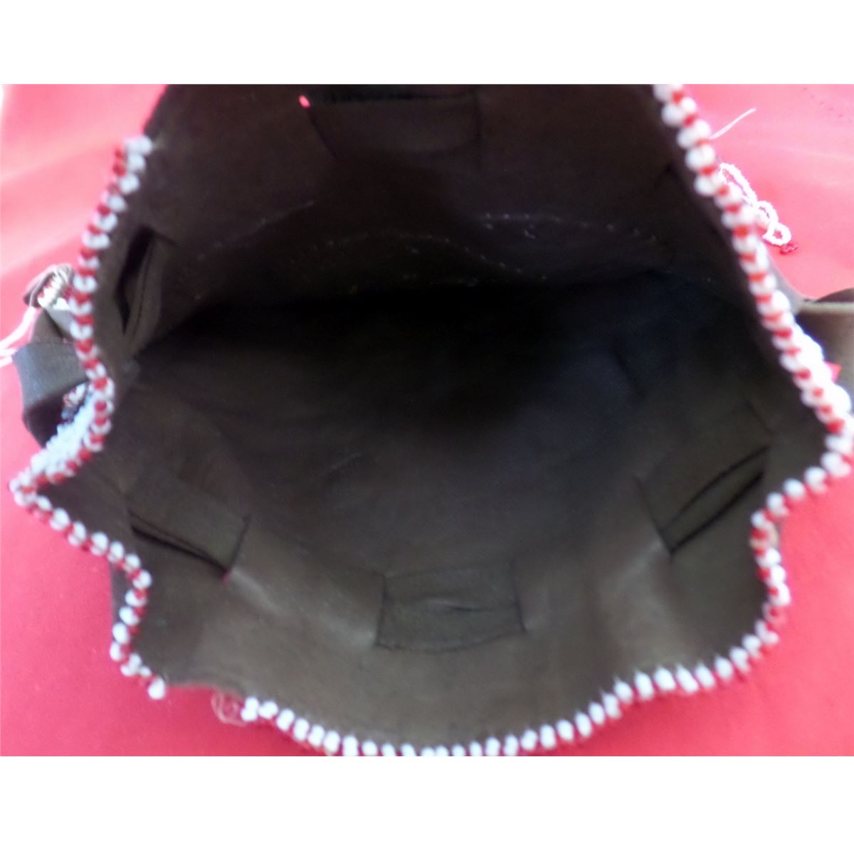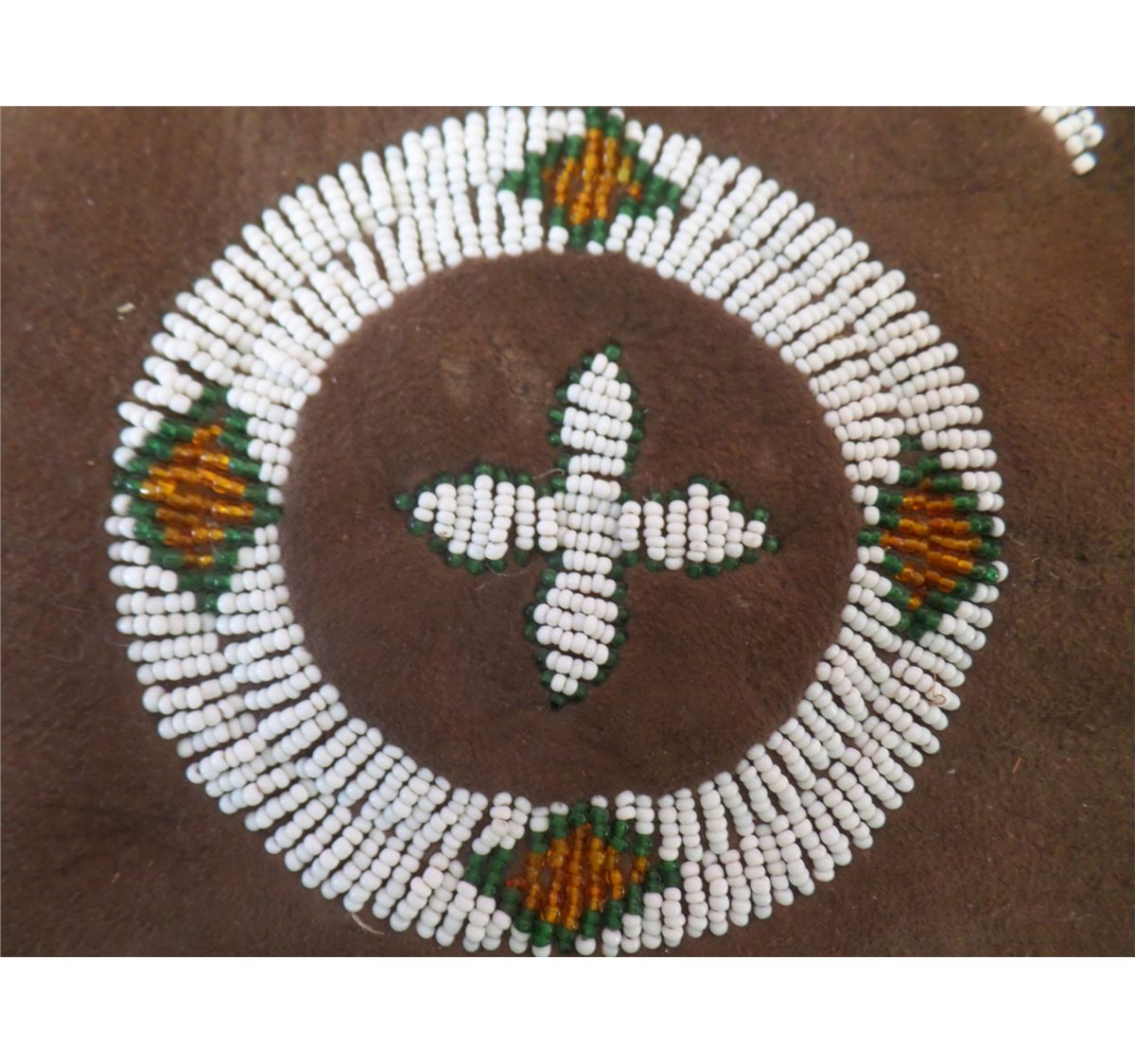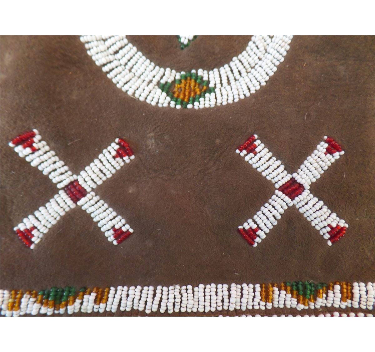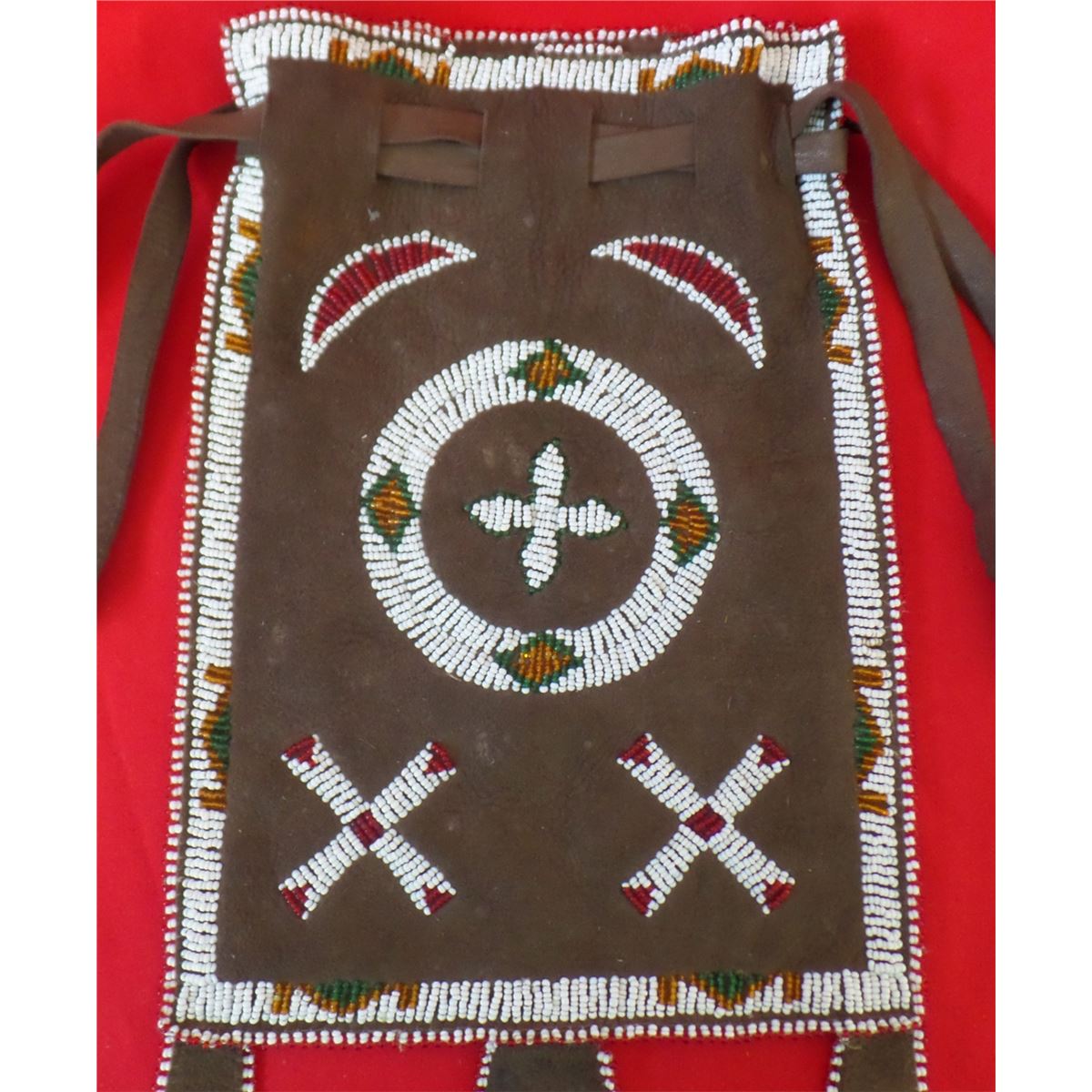 Apache Beaded Bag measuring 14 x 7 inches. There is slight bead loss, but overall bag is in good condition. There are animals on tabs, possibly lizards. Please look at pictures. Bag is made from cowhide and glass beads. Shipping $14.00o