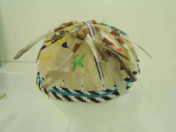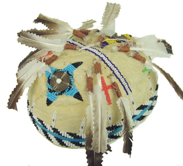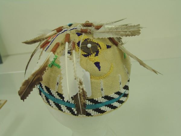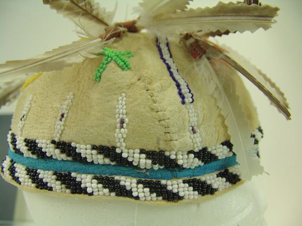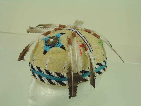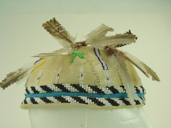 Ca. 1960s M/L Traditional, hand crafted white buckskin "War Hat" with lazy stitch beaded crosses and bands, and with trimmed feather suspensions. Very good condition. **These are from the private display collection of the "Largest Rose Tree in the World, and Museum" which has been located in downtown Tombstone, AZ for the last 30 years.