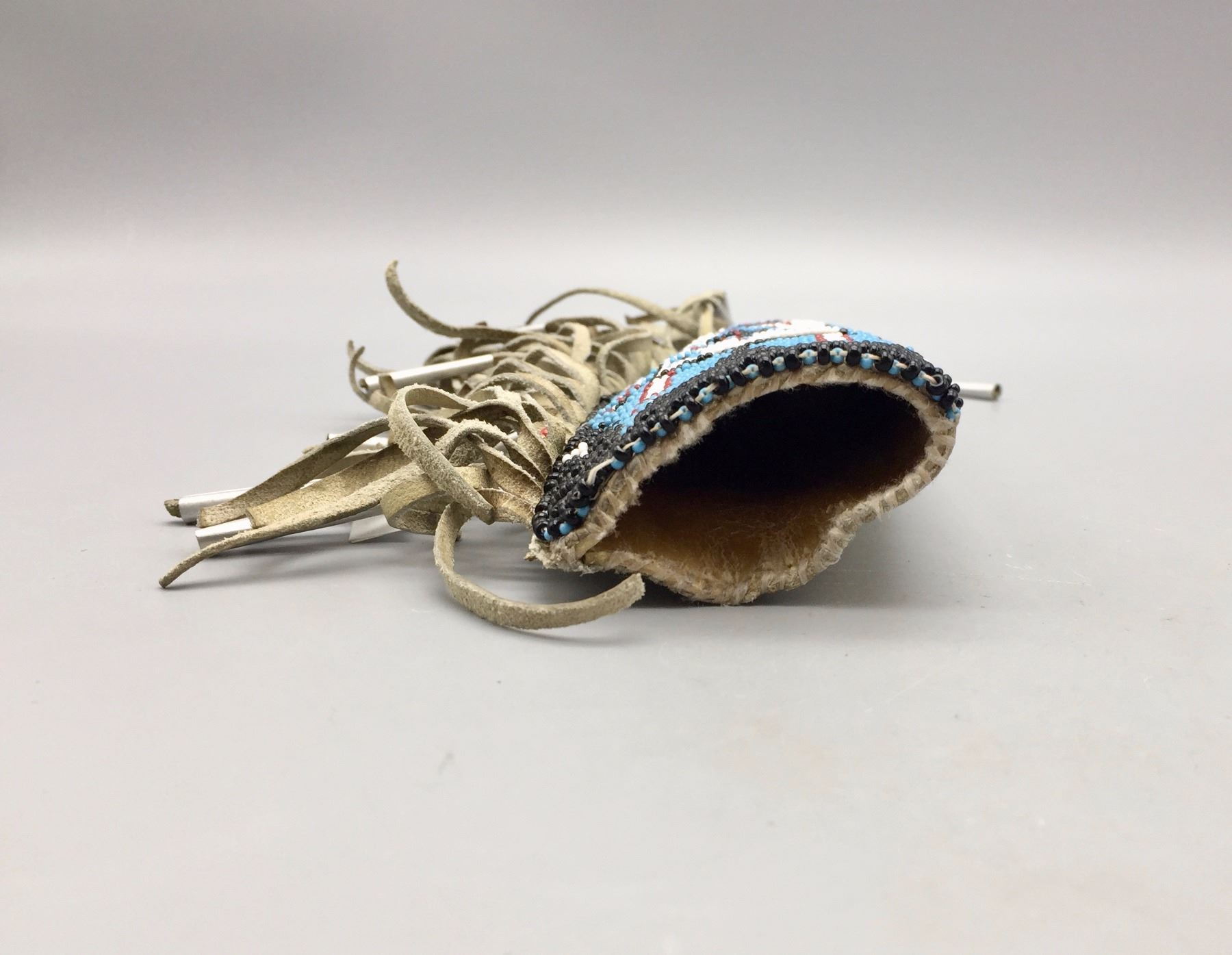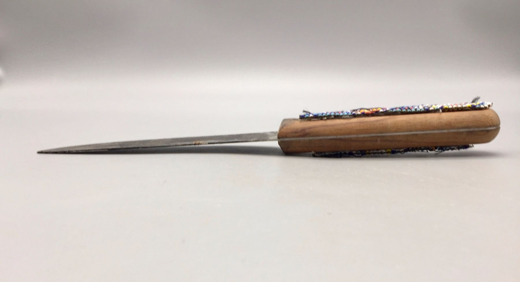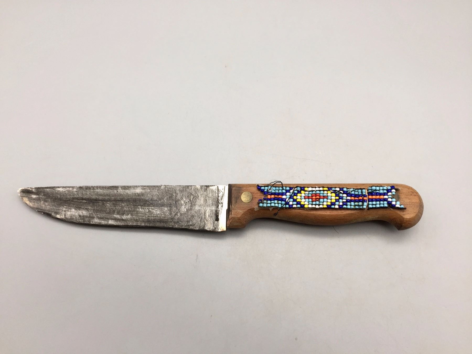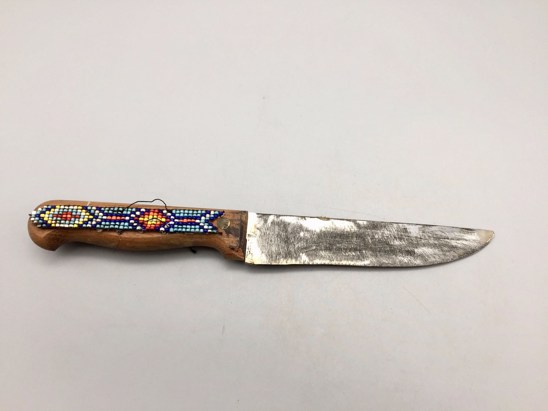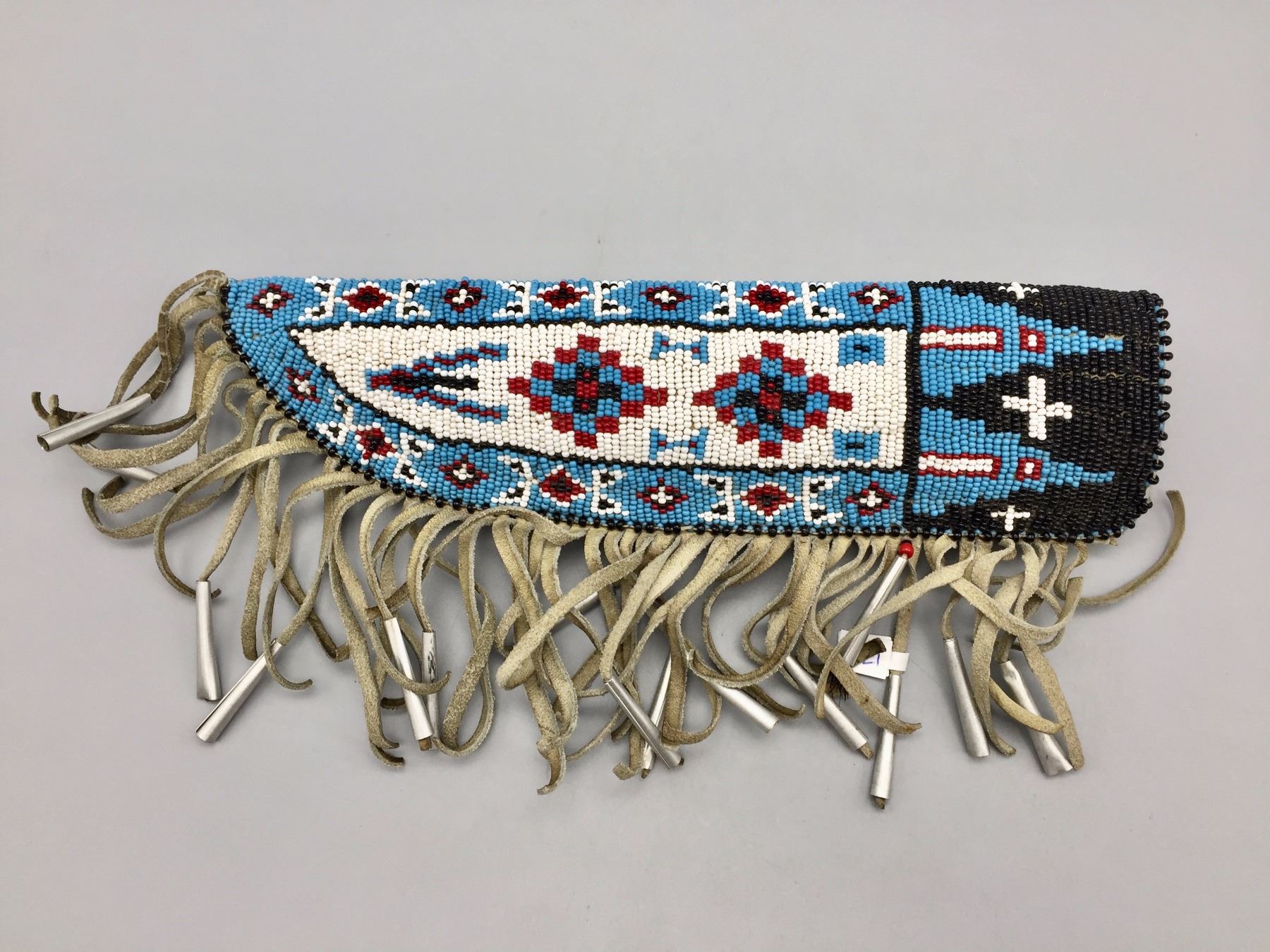 Description: A nicely beaded, Apache knife sheath. The knife has no real value and is mostly for display. Maker: Unknown Apache artisan on the Knife sheath. Approx. Age: Vintage. Size: Sheath measures approx. 10” l x 3” w and knife measures 10” l x 1 1/4” w. Condition: Good for its age, normal wear expected. Please look closely at the pictures - they are an important part of our description. Shipping: There will be a $5 handling / packaging fee for shipping this lot. The actual cost of postage will be added on top of that.
