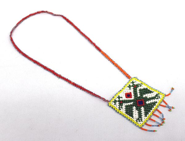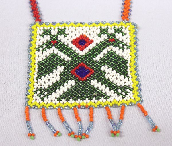 Native American Apache Beaded Necklace, beautifully beaded in Apache tradition, vibrant bead colors of orange, metallic green, silver metallic, red, white, yellow, teal metallic, green, cobalt blue, and periwinkle, measures approx. 22'' end to end and pendant 2.5'' x 3''.