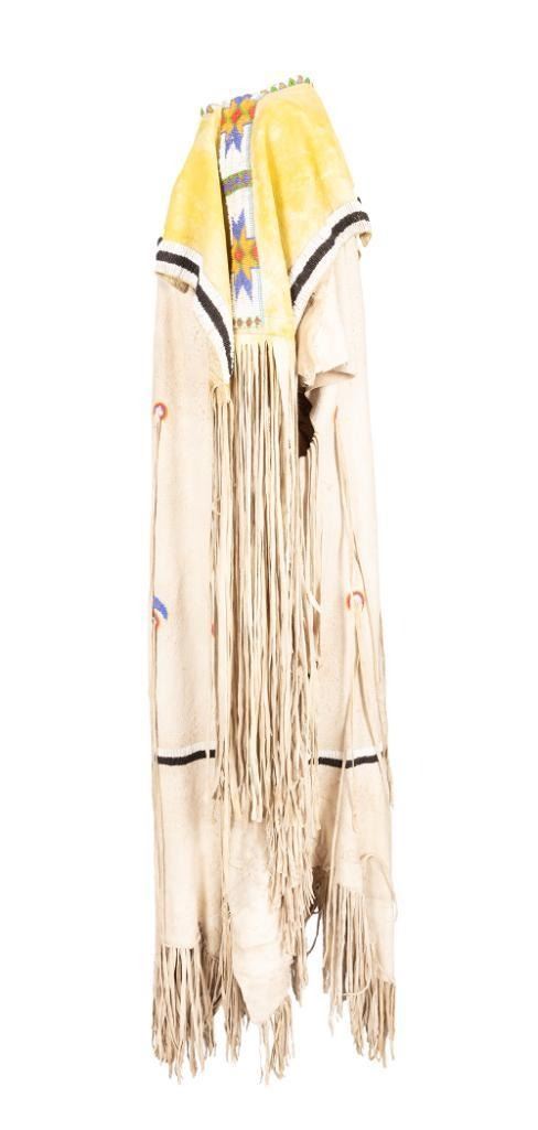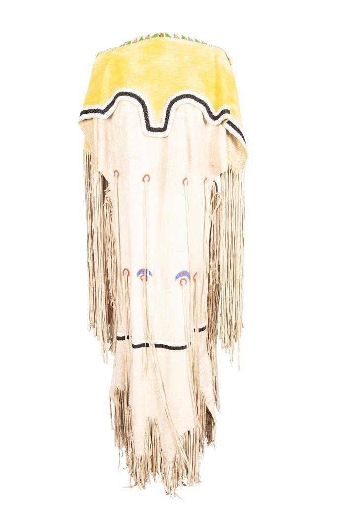 36" yoke, 57" long. Accented with small beaded medallions, fringe and large geometrically beaded trade beads on yellow ochred hide. Circa 1930.
