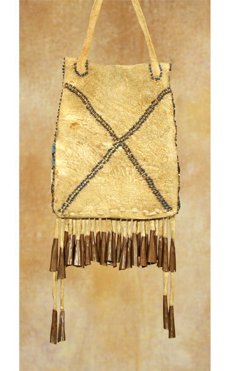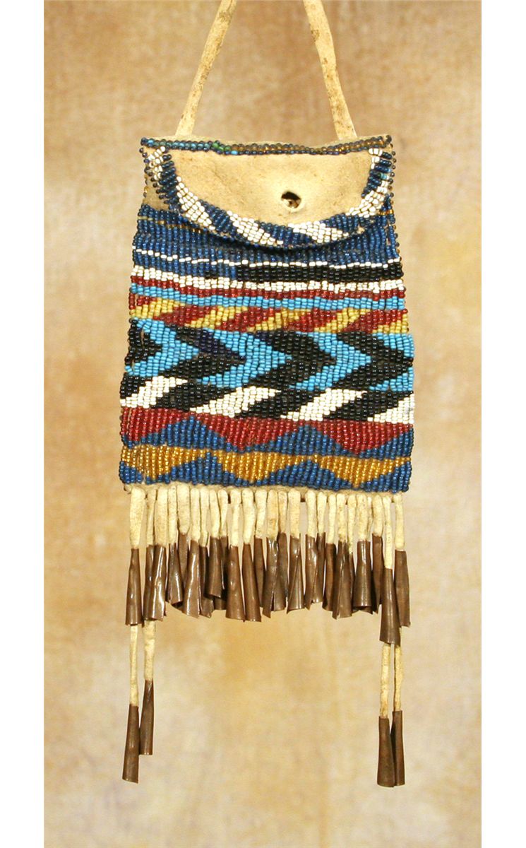 Apache Strike-a-Lite Bag. 5" x 4" with 2" - 4" fringe terminating in tin cones. Highly decorative patterns. Circa 1900.