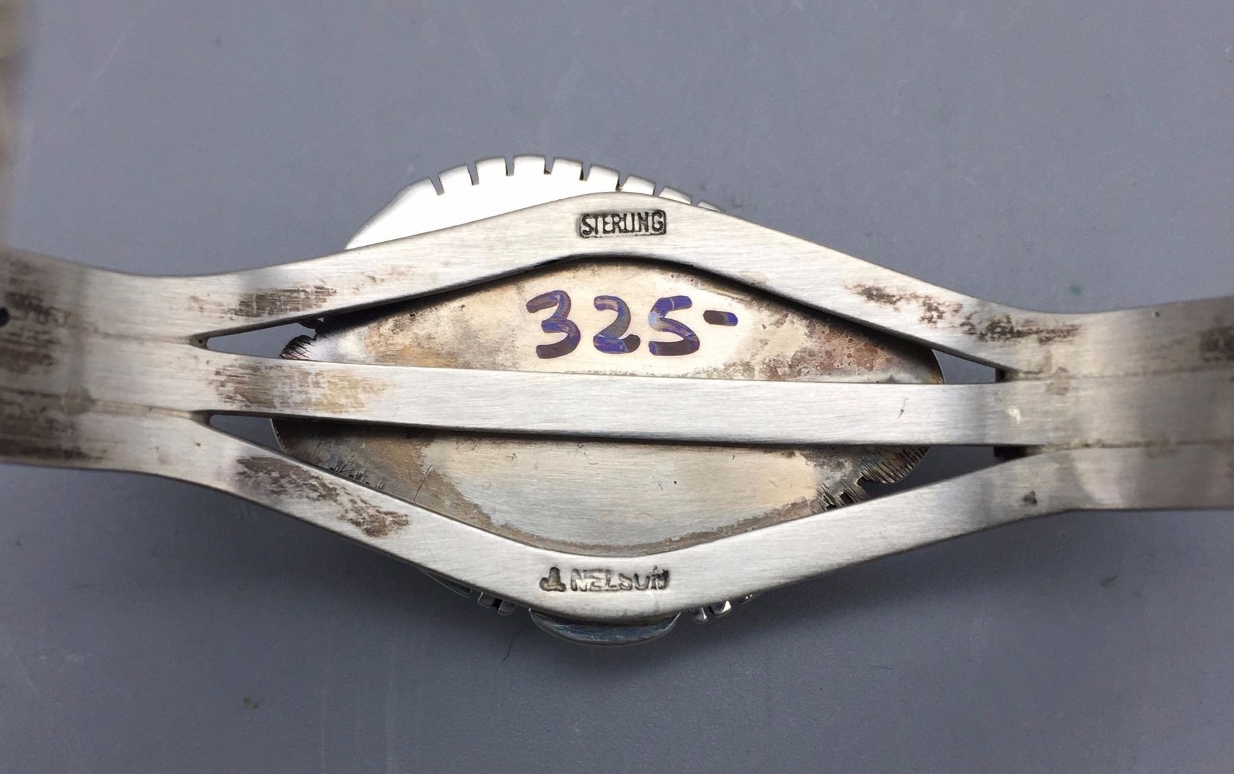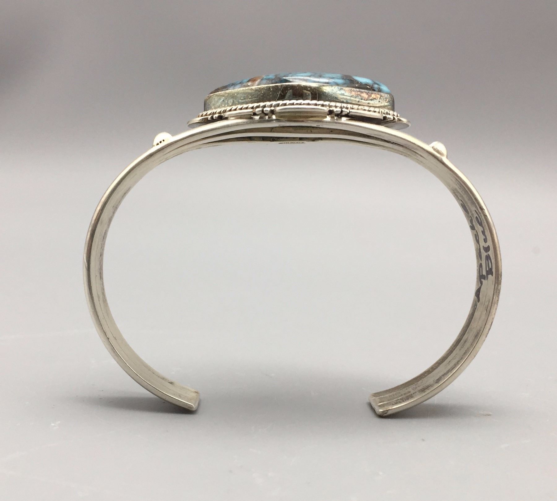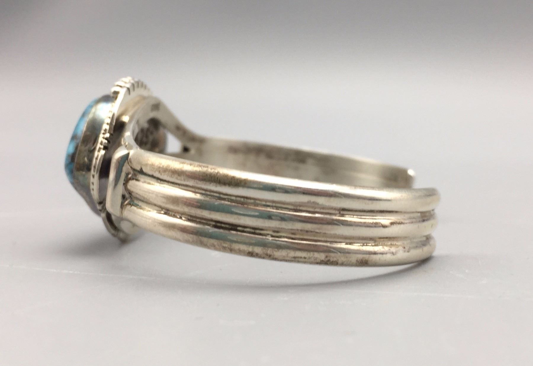 Maker: J. Nelson, Navajo. Approx. Age: Fairly modern. Size: Inside circumference 5 1/2” with an additional 1 1/8” opening (fits 6 5/8” wrist). 1” at it’s widest and weighs 31.4 g. Additional Info: Apache Blue turquoise and sterling silver cuff bracelet. Condition: Good, normal wear expected. New, old stock (NOS). Please look closely at the pictures - they are an important part of our description. Shipping: There will be a $5 handling / packaging fee for shipping this lot. The actual cost of postage will be added on top of that.