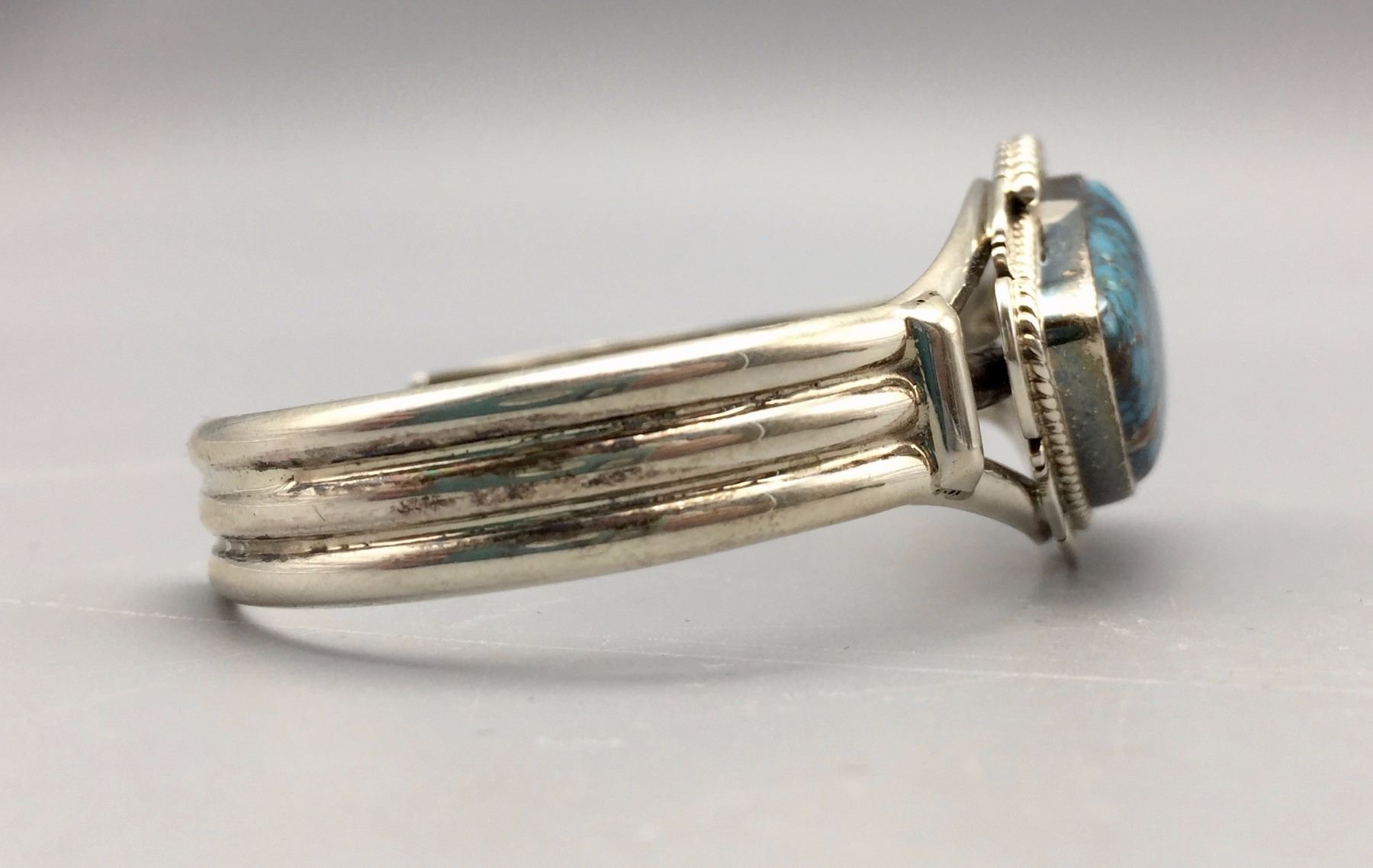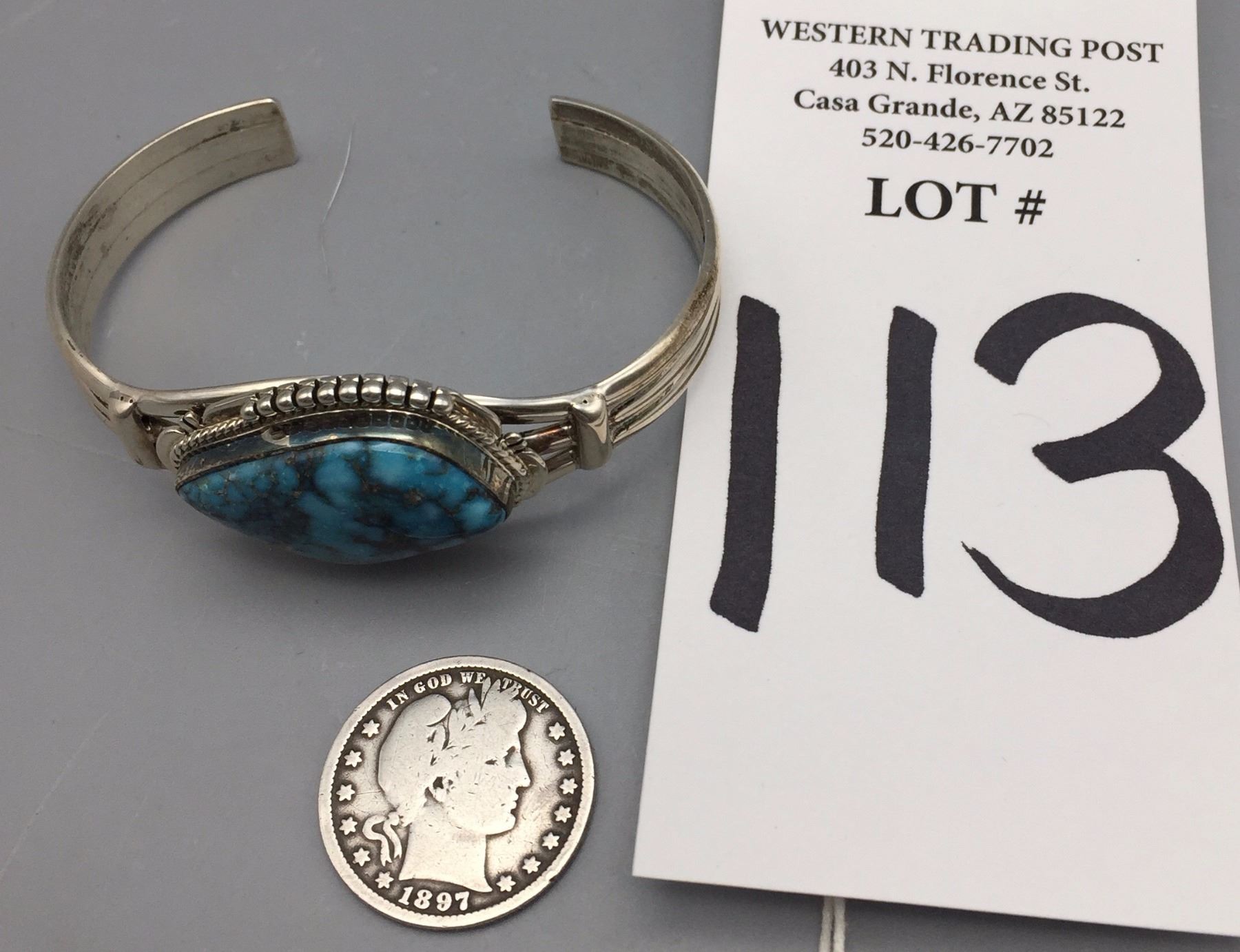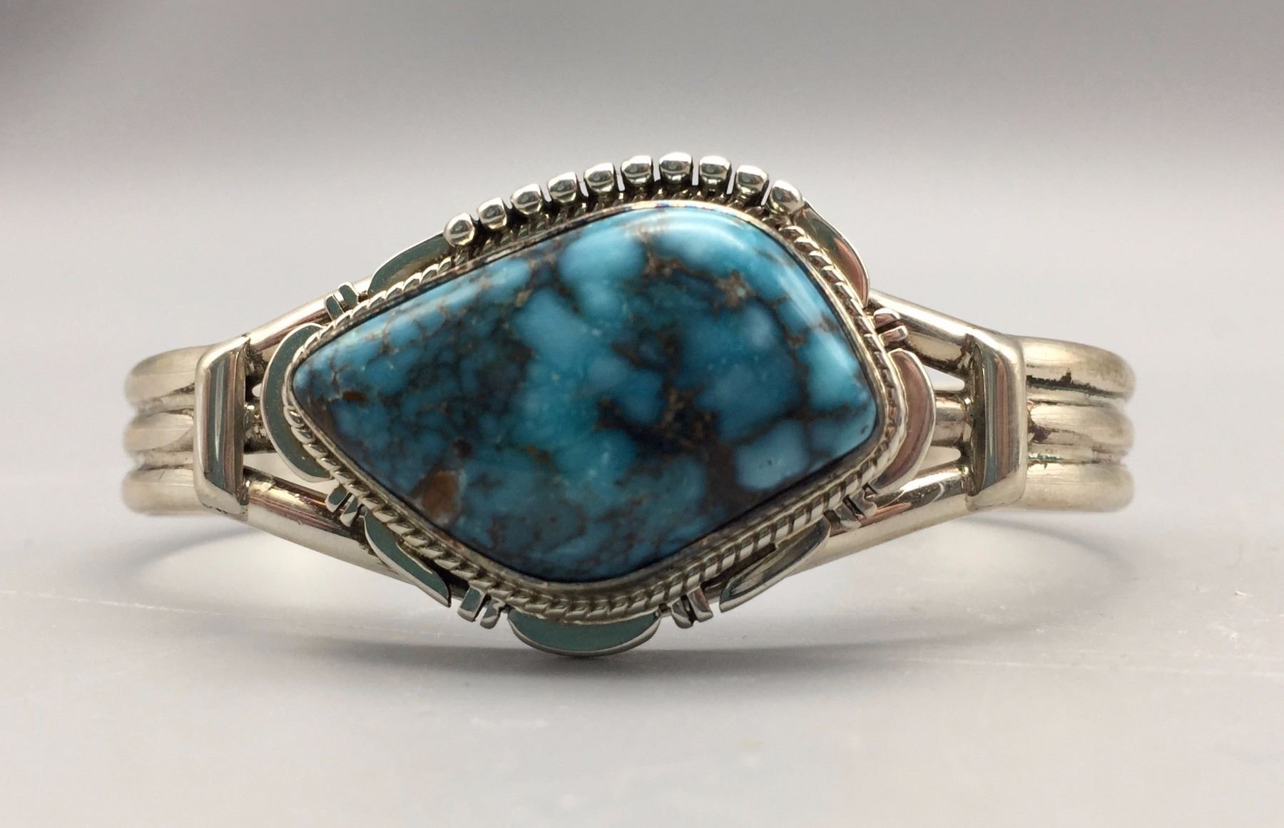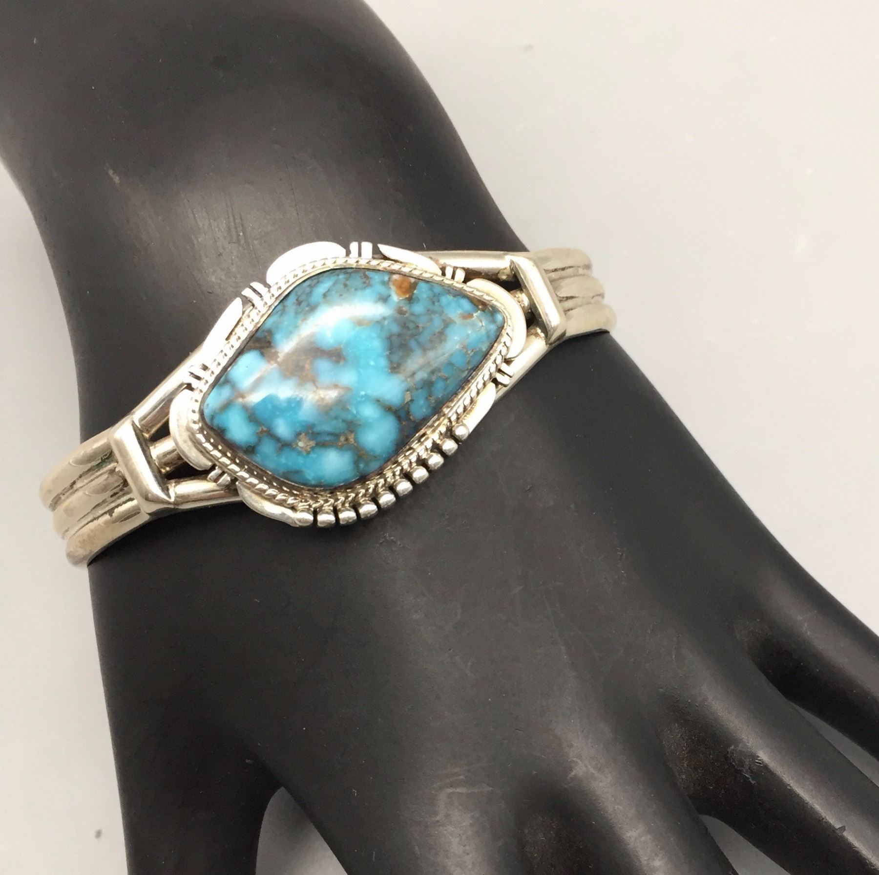 Maker: J. Nelson, Navajo. Approx. Age: Fairly modern. Size: Inside circumference 5 1/2” with an additional 1 1/8” opening (fits 6 5/8” wrist). 1” at it’s widest and weighs 31.4 g. Additional Info: Apache Blue turquoise and sterling silver cuff bracelet. Condition: Good, normal wear expected. New, old stock (NOS). Please look closely at the pictures - they are an important part of our description. Shipping: There will be a $5 handling / packaging fee for shipping this lot. The actual cost of postage will be added on top of that.