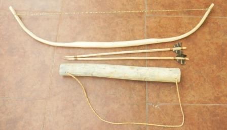 Apache Bow with wood string. The Bow measures 42 by 7 inches. The two Arrows are 24 inches each. The quiver is 21 by 3 inch and is made from Aguava plant stock. Apache from Southern New Mexico. Very Good Condition Shipping $20.00