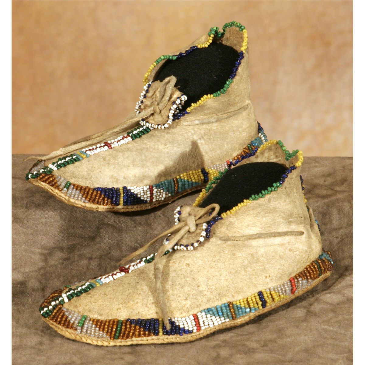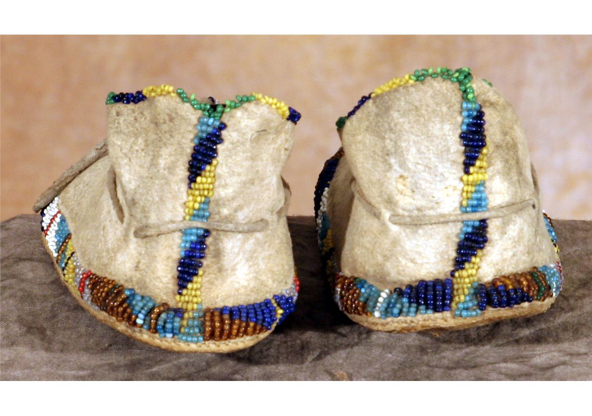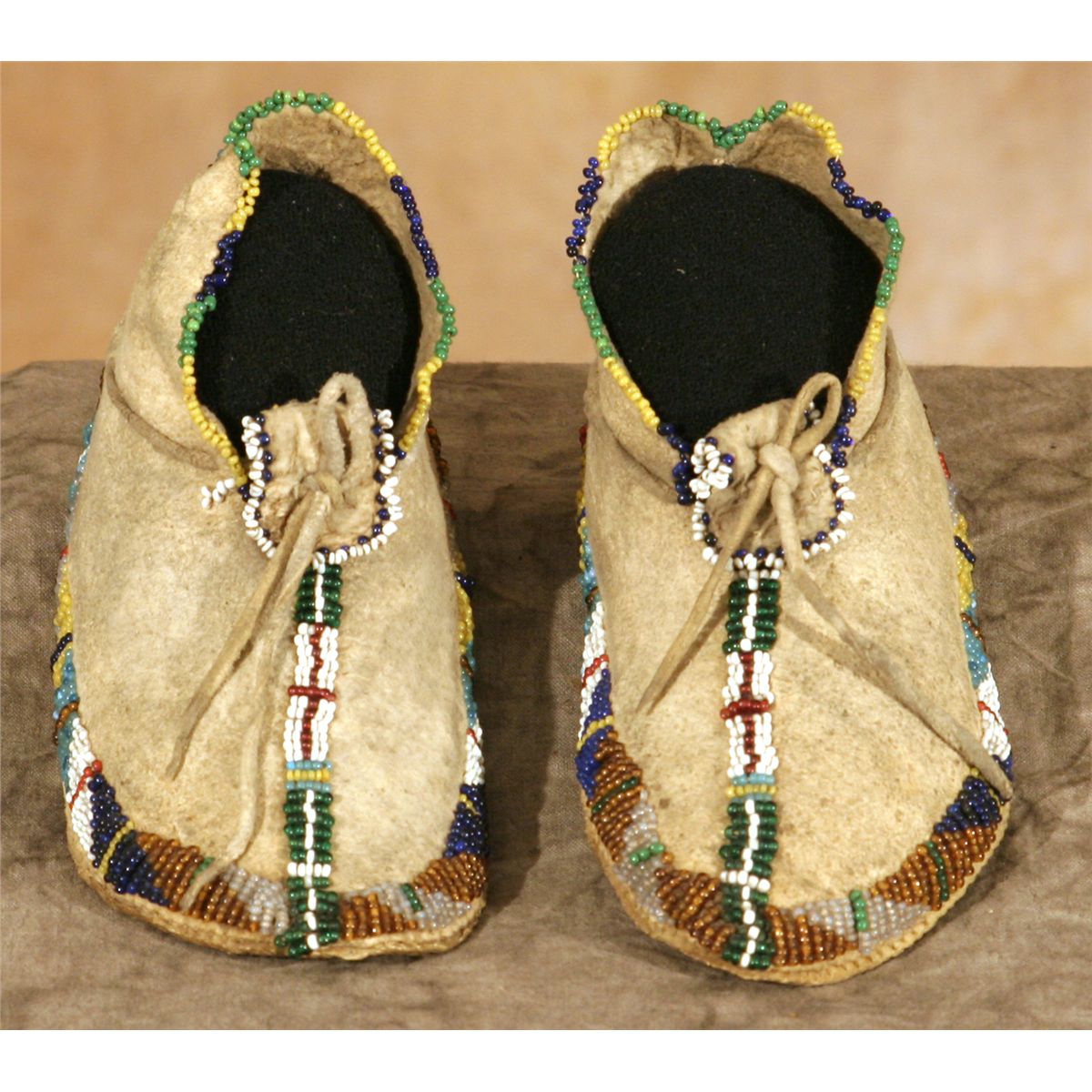 Apache Boy's Moccasins. 6" long. Some asymmetry in the beadwork around the heels. Tongues and cuffs are edged in beadwork. 19th century.