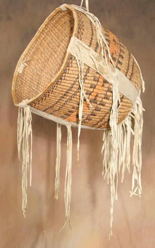 Apache Burden Basket. 11" x 11" with 10" hide fringe. 19th century basket, fringe added 1940s. (est $1,000-1,500). For condition reports please visit: www.auctioninsantafe.com/cr2011.pdf