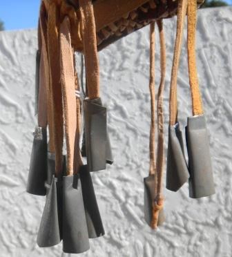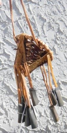 Apache Burden Basket with tin cones. Measures It is a White Mountain Apache made from willow deer hide and tin cones. It has 15 ten cones and measures 3x6 inches. Shipping $12.50