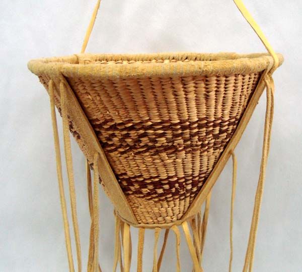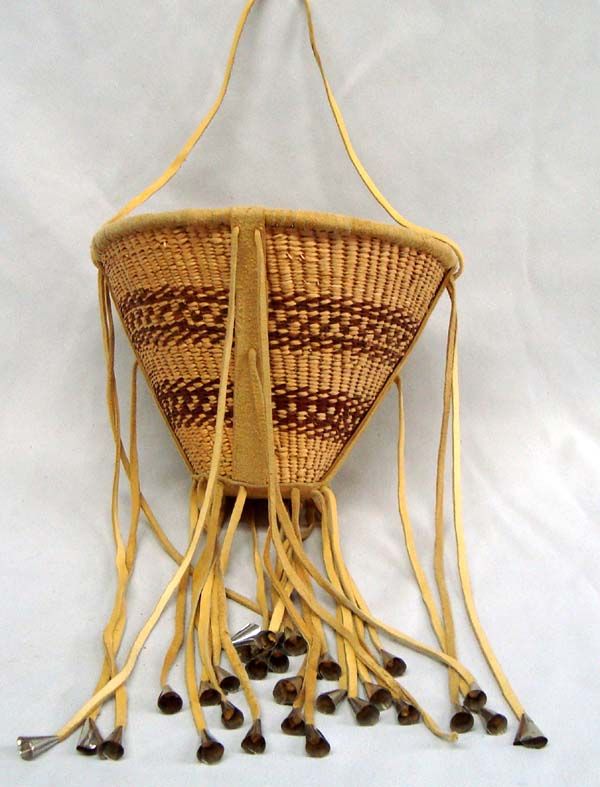 Apache Burden Basket.  9.75'' diameter, 6.75''H not including 9'' fringe.  Metal cones tinkle with a sweet sound when they move.