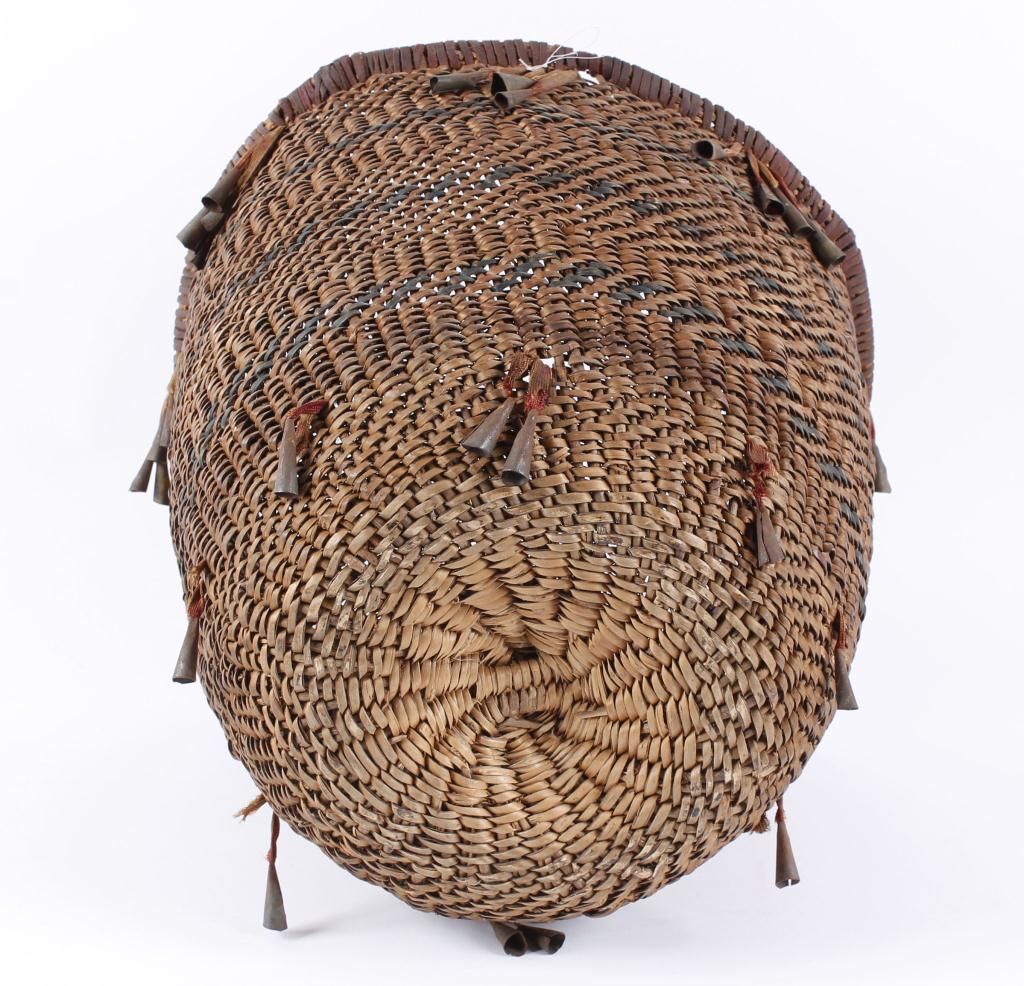 Striped design, shell jingle bells, fair to good condition with scattered losses, great patina, measures approx 11"Hx12 1/2" diameter.