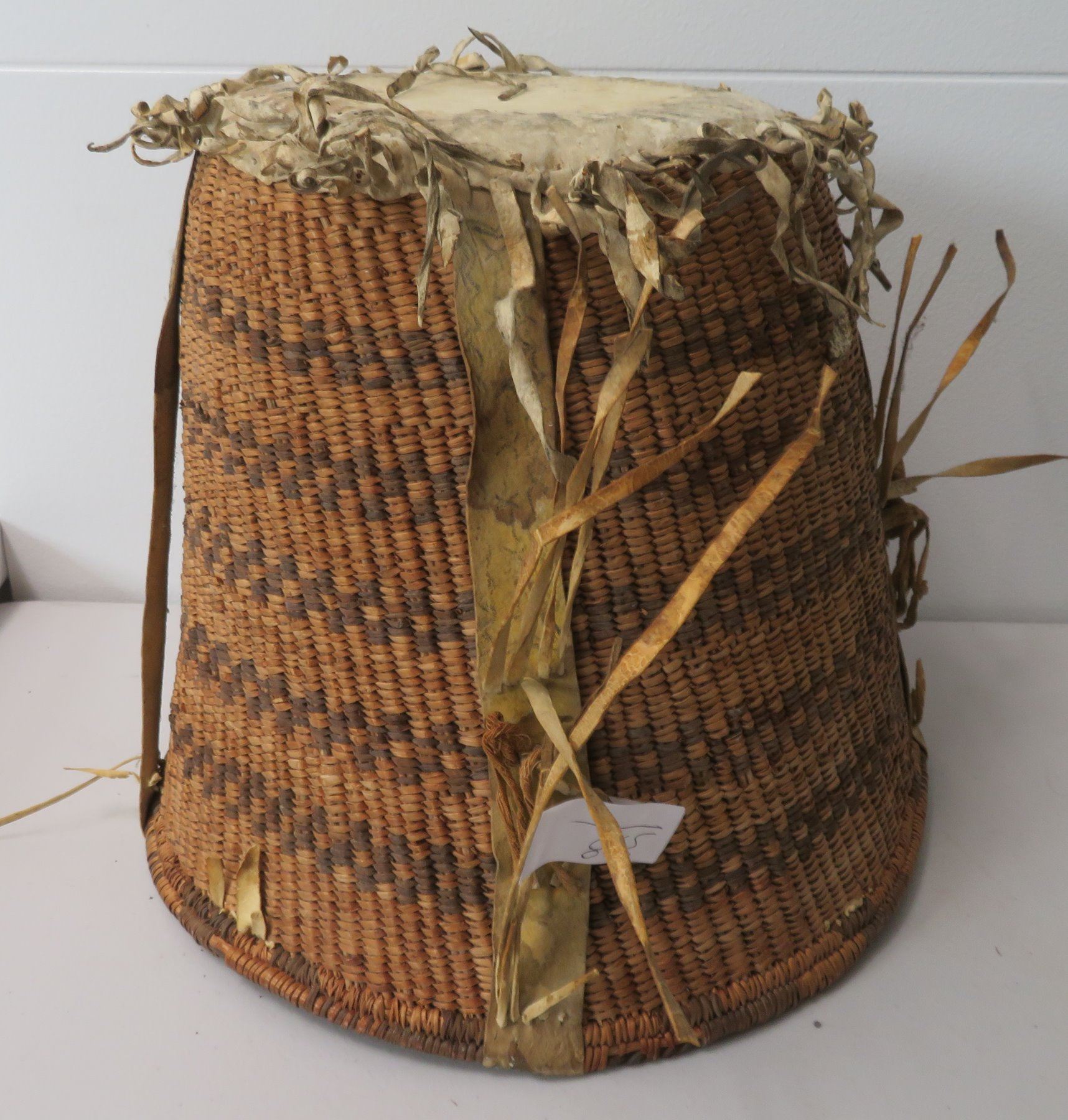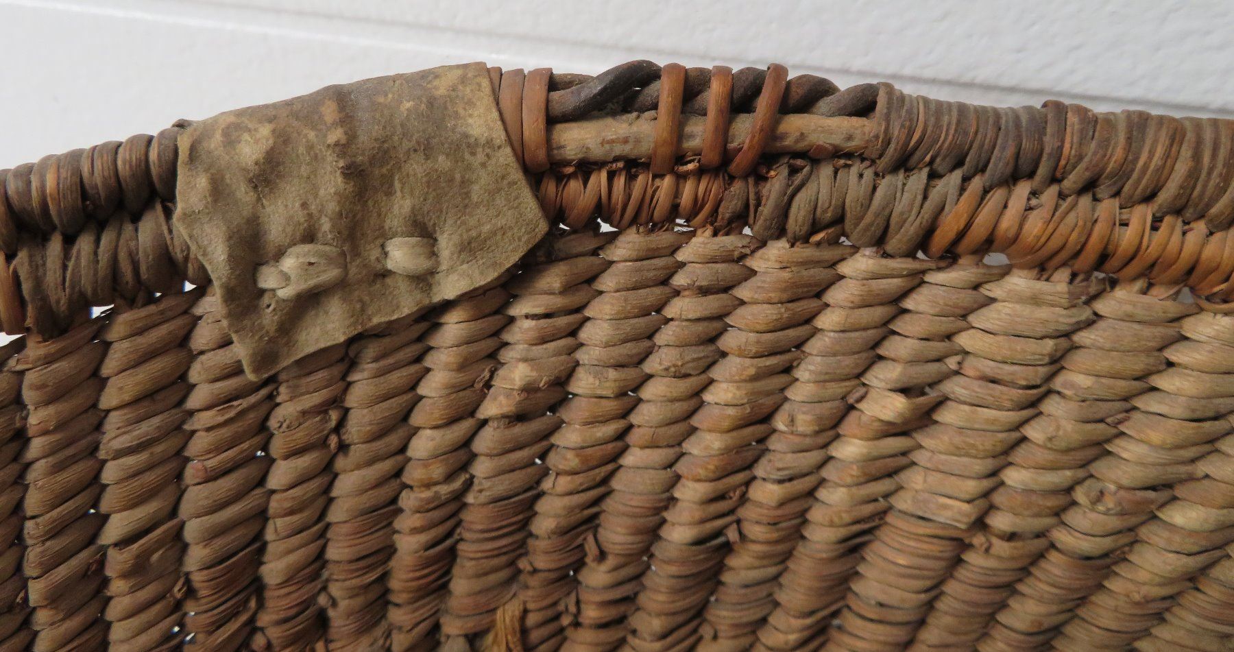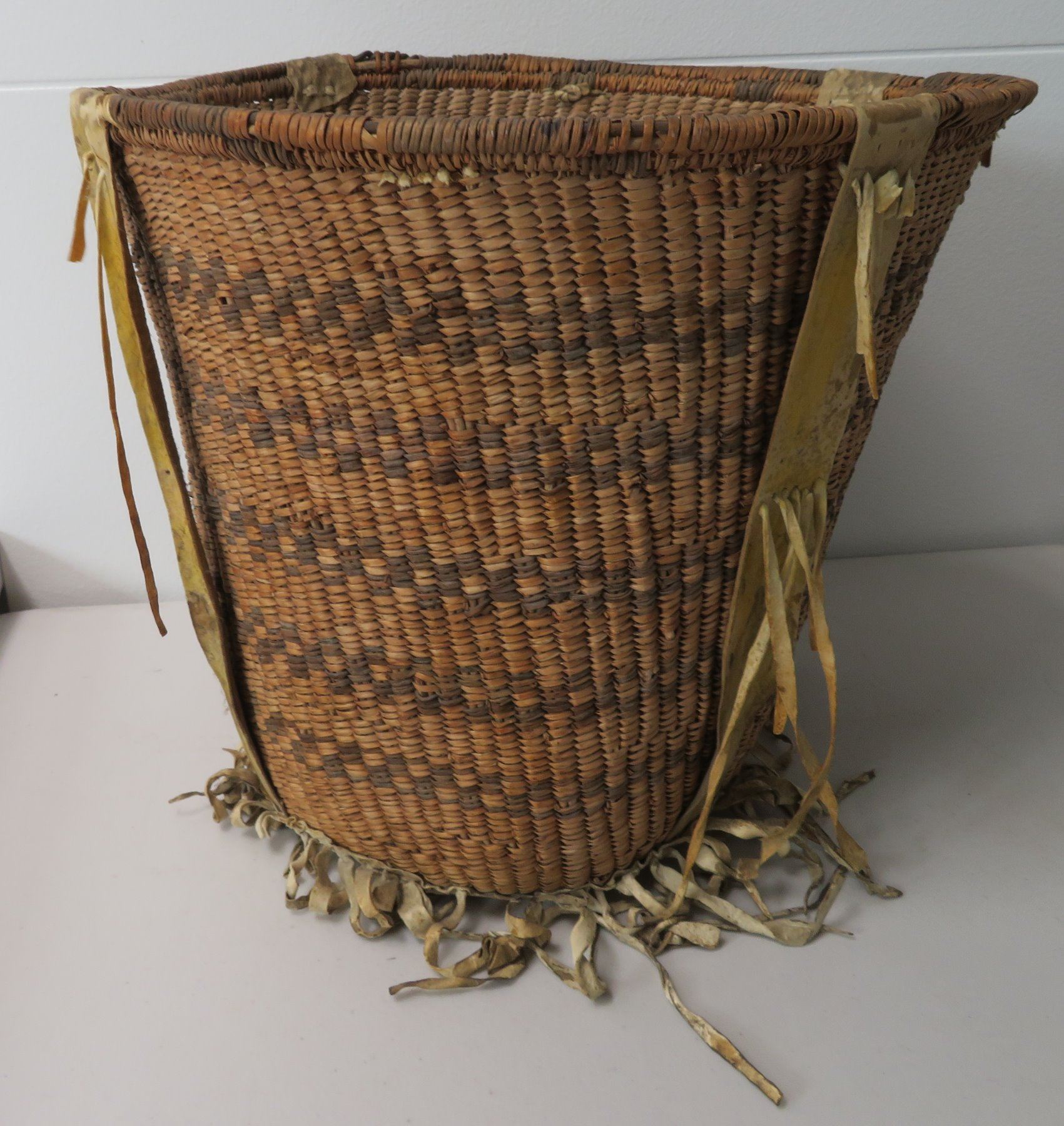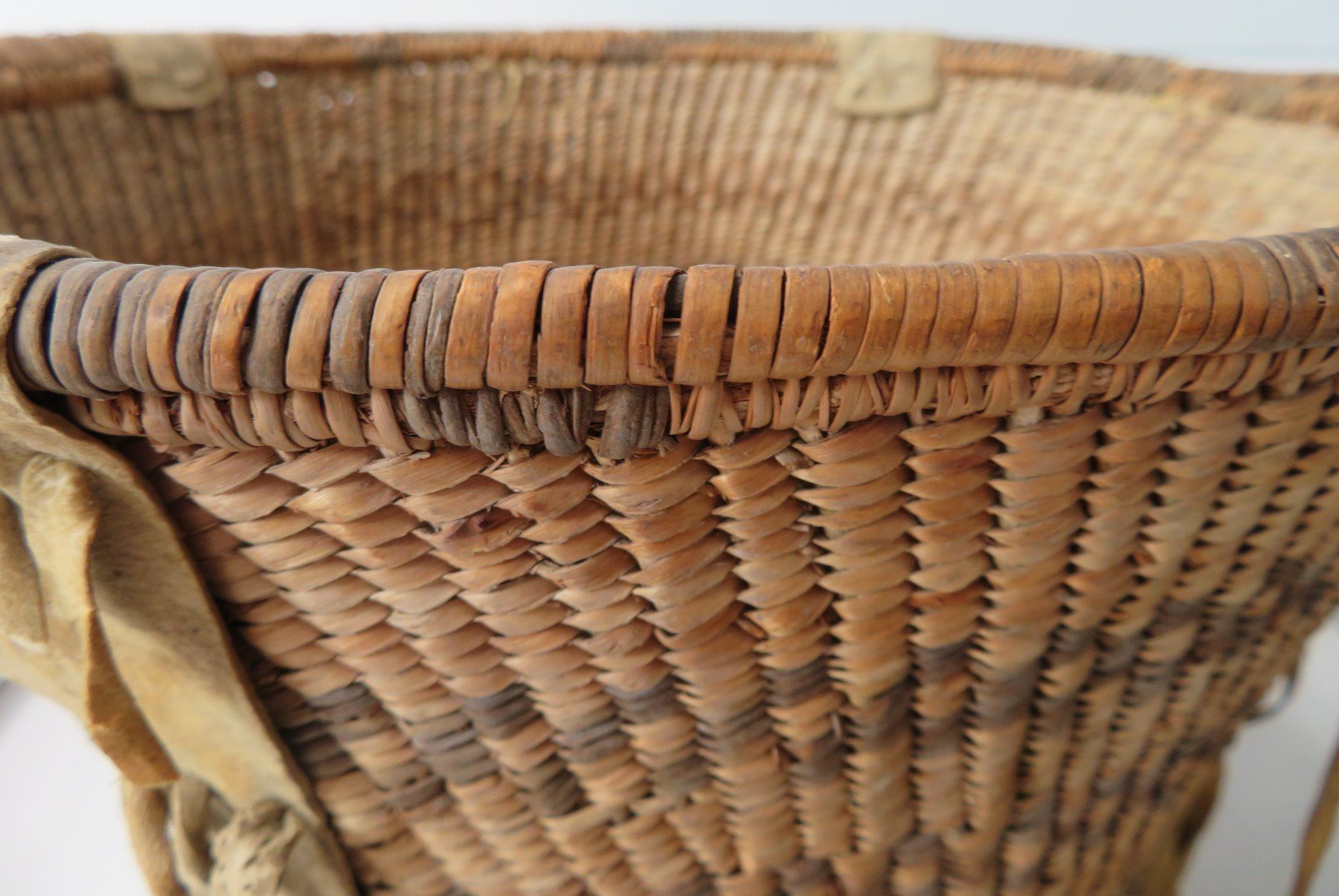 Apache Burden Basket, c. 1880s-1900s. Made of willow, devil's claw, braintanned buckskin and wood, the item measures 12" tall x 14" wide. White Mountain Apache, Arizona. Basket w/early construction w/minor whipping stitch damage used for transporting goods and food. Adorned with buckskin fringe, yellow ochre and anthropomorphic scene. Condition: Good w/minor wear, whipping stitch damage, see images. Shipping: $50.00 w/insurance and signature, due to value and size.