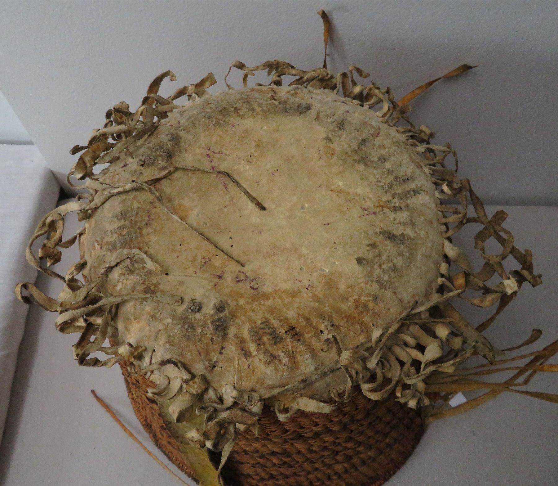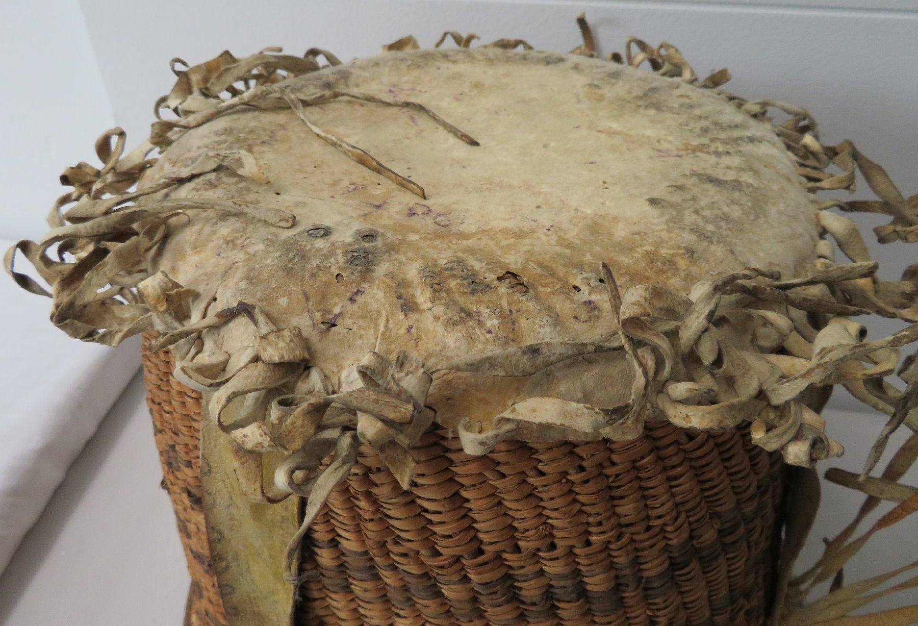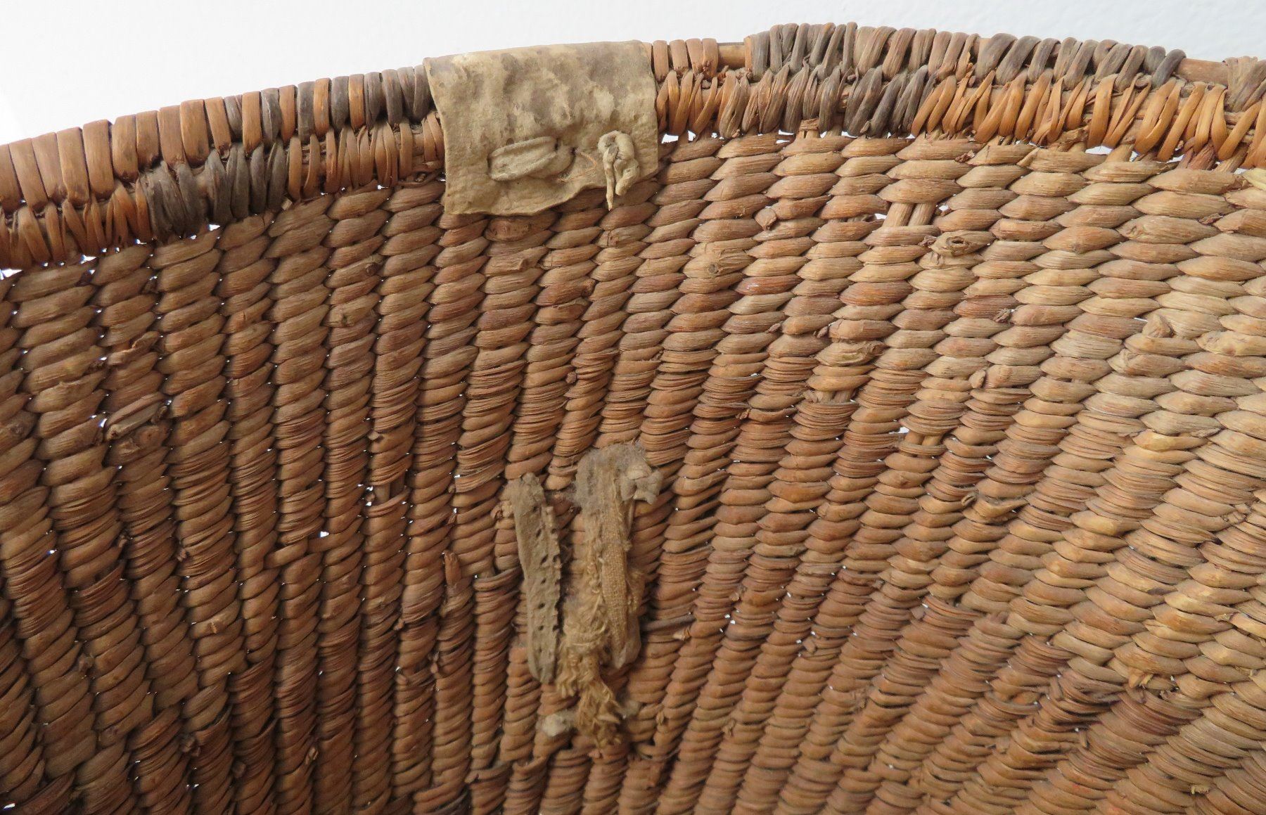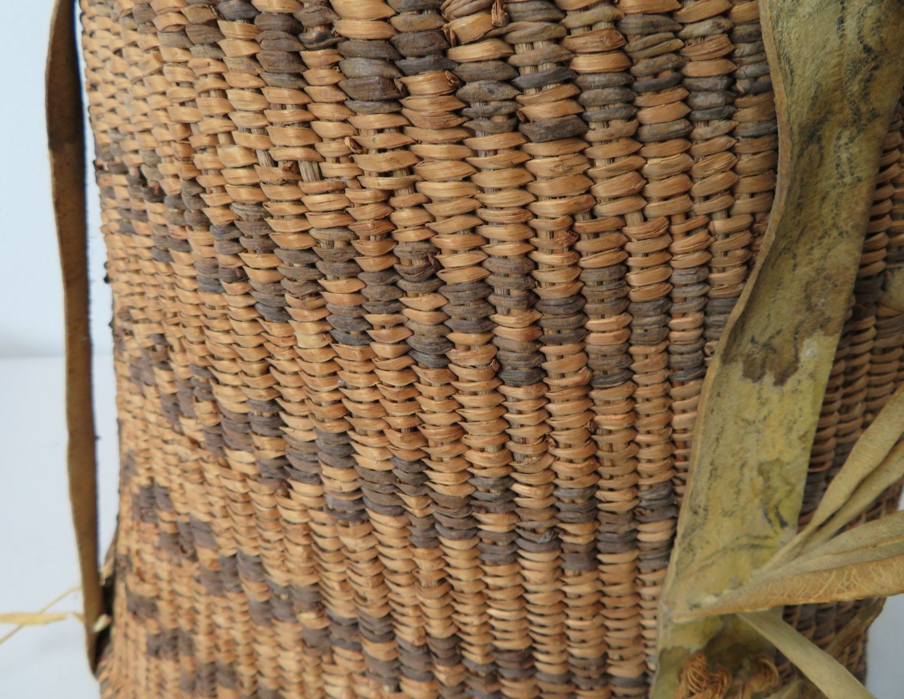 Apache Burden Basket, c. 1880s-1900s. Made of willow, devil's claw, braintanned buckskin and wood, the item measures 12" tall x 14" wide. White Mountain Apache, Arizona. Basket w/early construction w/minor whipping stitch damage used for transporting goods and food. Adorned with buckskin fringe, yellow ochre and anthropomorphic scene. Condition: Good w/minor wear, whipping stitch damage, see images. Shipping: $50.00 w/insurance and signature, due to value and size.