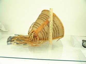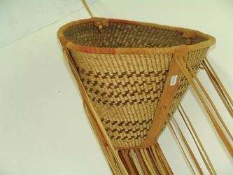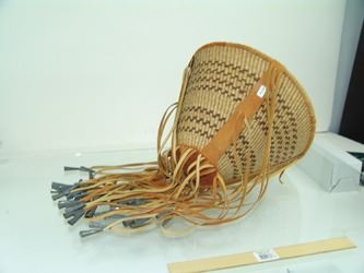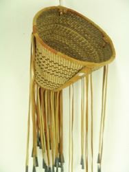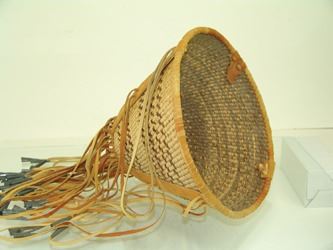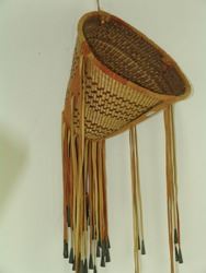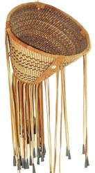 Beautiful, twined weave, conical shaped basket with the design reversed on the interior, and the exterior trimmed with the traditional, reinforcing leather bands, and with long fringe having tin cone ends. Very good condition. Ca. 1970s. 9" x 12" + fringe.