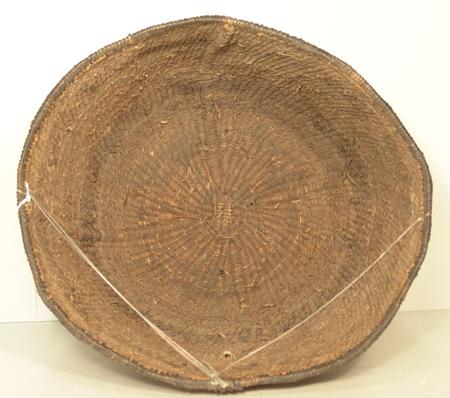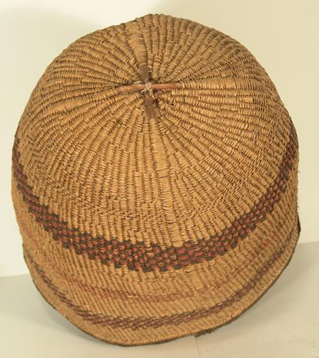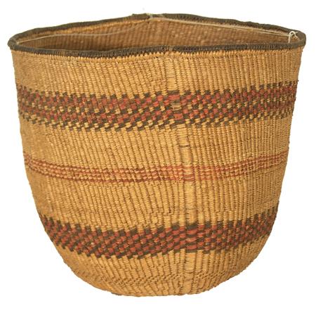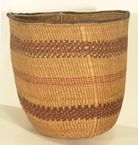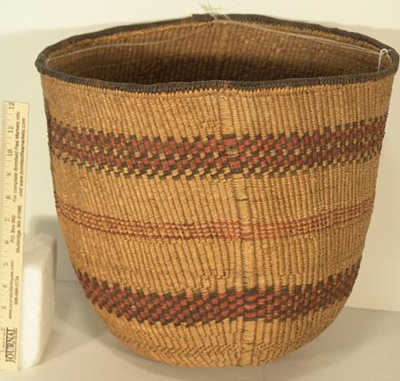 Large traditional design basket with color bands of red and black on exterior. Purchased from Hogan Shop in 1976 for $150; appraisal value $2,500. Condition: very good. 15" high x 15" diameter
