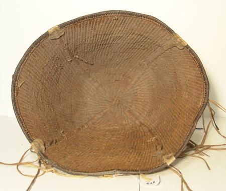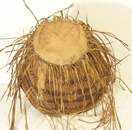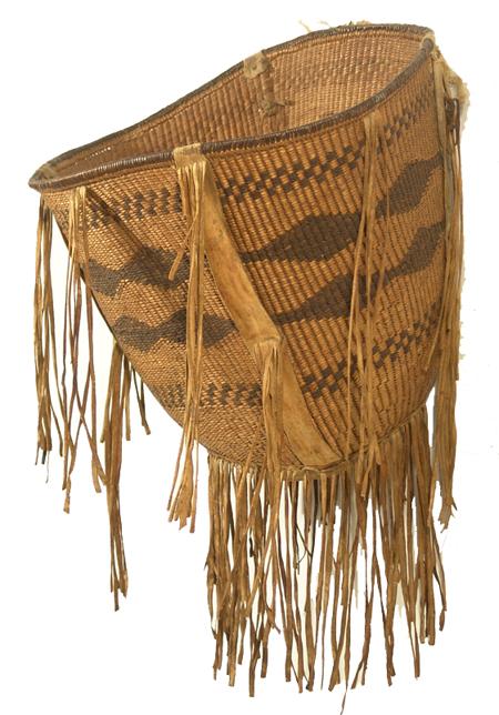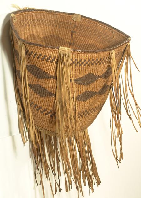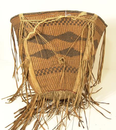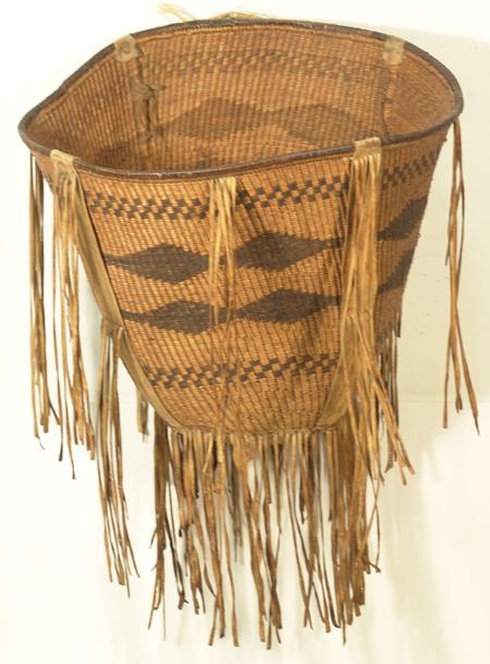 Rare traditional tightly woven burden basket with diamond designs and buckskin fringe. Purchased from Orley in 1975 for $1,100; appraisal value $2,200. Condition: very good. 16" high x 16" diameter plus fringe