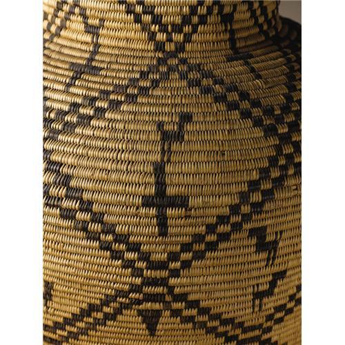 <B>Apache Coiled Pictorial Basket</B></I><BR>Circa 1920<BR>Height 16 in. Diameter 12 1/2 in.<BR><BR>This basket is characterized by its barrel shaped body with slightly flaring sides, rounded shoulder, tall neck, and a flaring rim. The olla is worked overall with a diamond lattice pattern with chickens, crosses, and geometric forms placed within each diamond.<BR><BR>Provenance<BR>Bonhams and Butterfields, Sale 7477E, Lot 3193, December 8, 2003.<BR><BR> <BR><BR><B>Important notice:</