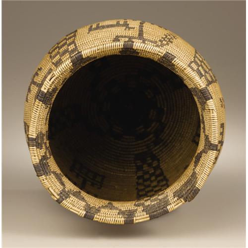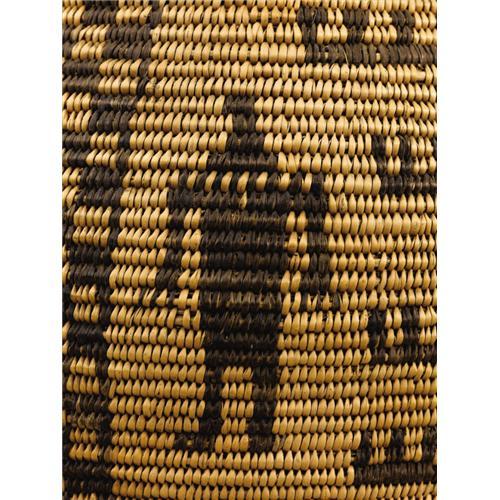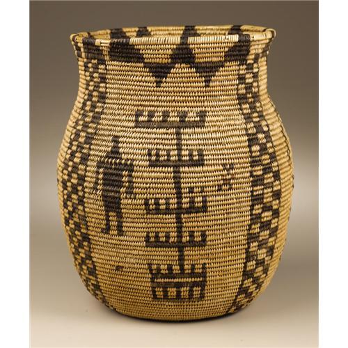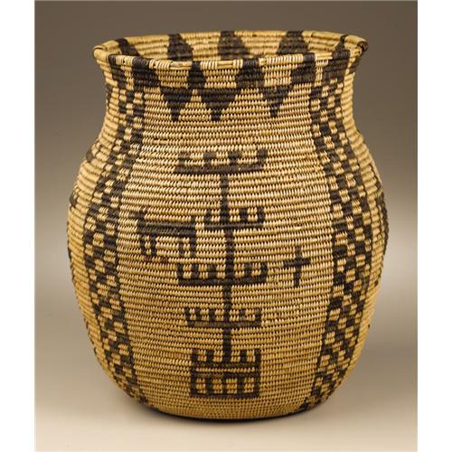 <B>Apache Coiled Pictorial Basket</B></I><BR>Circa 1910<BR>Height 11 in. Diameter 9 1/4 in.<BR><BR>This well made basket features a series of human figures standing next to complex vertical and horizontal line forms. Checkered vertical design bands frame the humans from base to rim. The rim is decorated with upright and inverted triangles. The willow background has taken on a soft, mellow patina.<BR><BR>Provenance<BR>Hudson Trading Co., Oracle, Arizona.<BR><BR> <BR><BR><B>Important notice:</