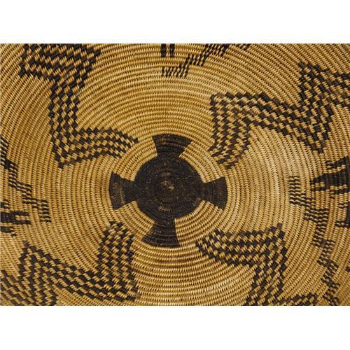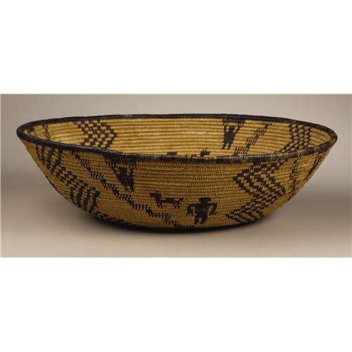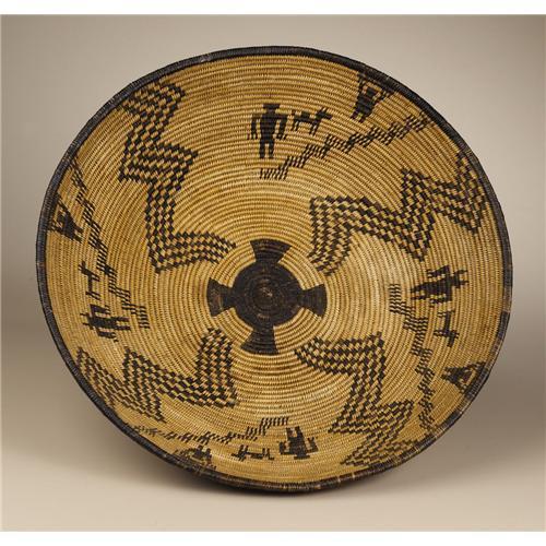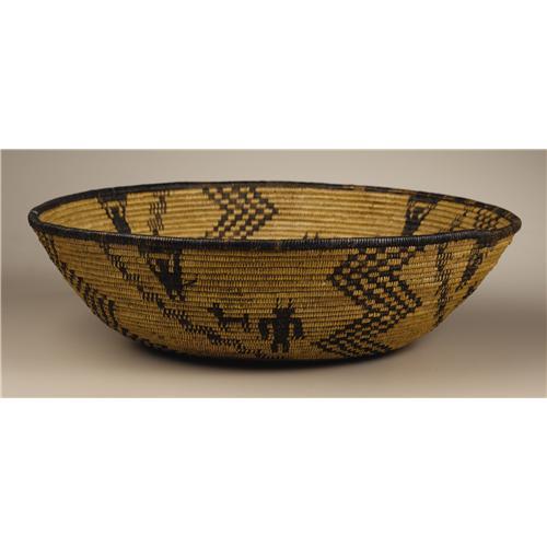 <B>Apache Coiled Pictorial Bowl</B></I><BR>Circa 1910<BR>Height 4 3/4 in. Diameter 17 1/4 in.<BR><BR>This tightly coiled basket with flaring sides is decorated with Apache Gaan dancers and quadrupeds. The Gaan dancer's mask with its elaborated crown is represented by two vertical lines above the figure's head. Those with raised arms are holding Gaan dance wands. The figures are separated by vertical, checkered zigzag bands moving from the central cross to the rim. The basket exhibits a rich honey-colored patina.<BR><BR>Provenance<BR>Terry DeWald, Tucson, Arizona.<BR><BR> <BR><BR><B>Important notice: