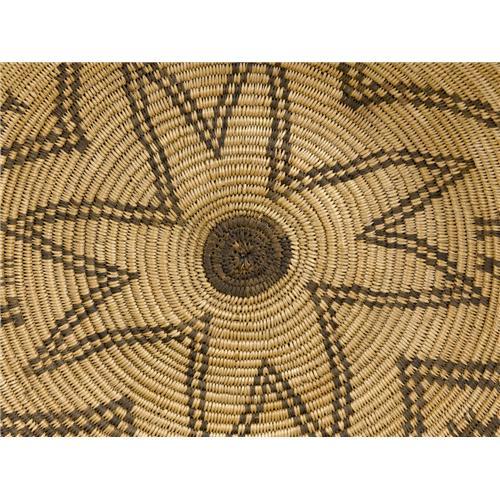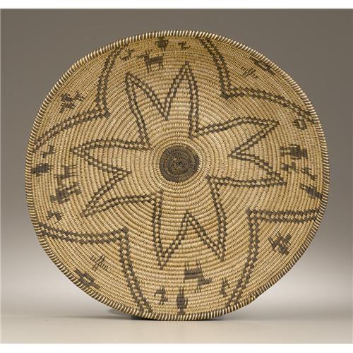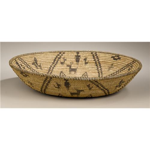<B>Apache Coiled Pictorial Bowl</B></I><BR>Circa 1910<BR>Height 3 1/2 in. Diameter 17 3/8 in.<BR><BR>This coiled basket with flaring sides features a central eight point star design. Human figures and quadrupeds of varying size are arranged around the sides. Four inverted triangular elements along the rim frame crosses and figures on horseback.<BR><BR>Provenance<BR>Philip Garaway, Venice, California.<BR><BR> <BR><BR><B>Important notice: