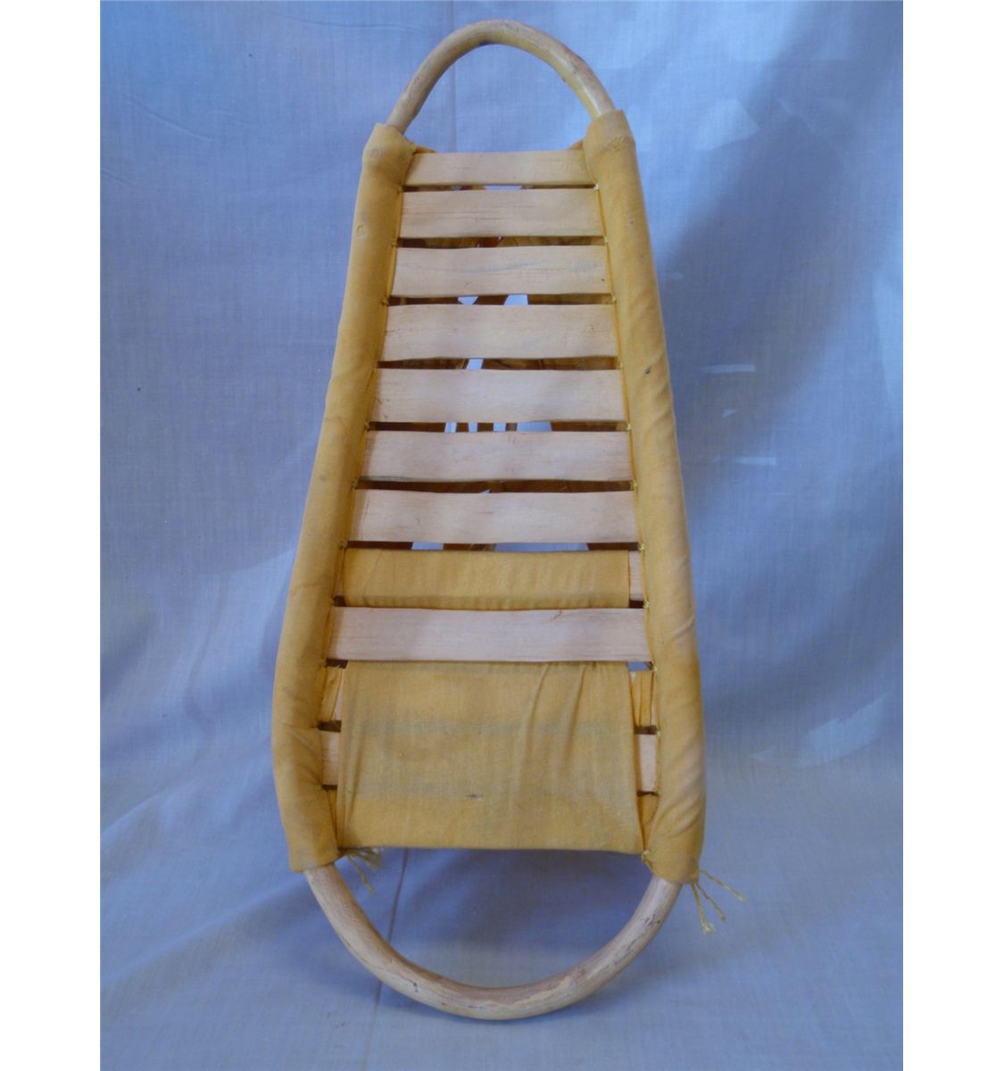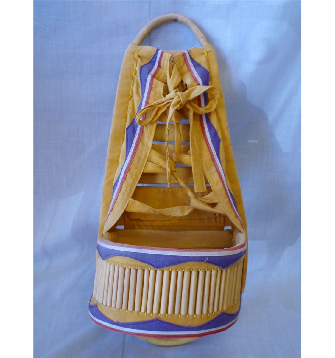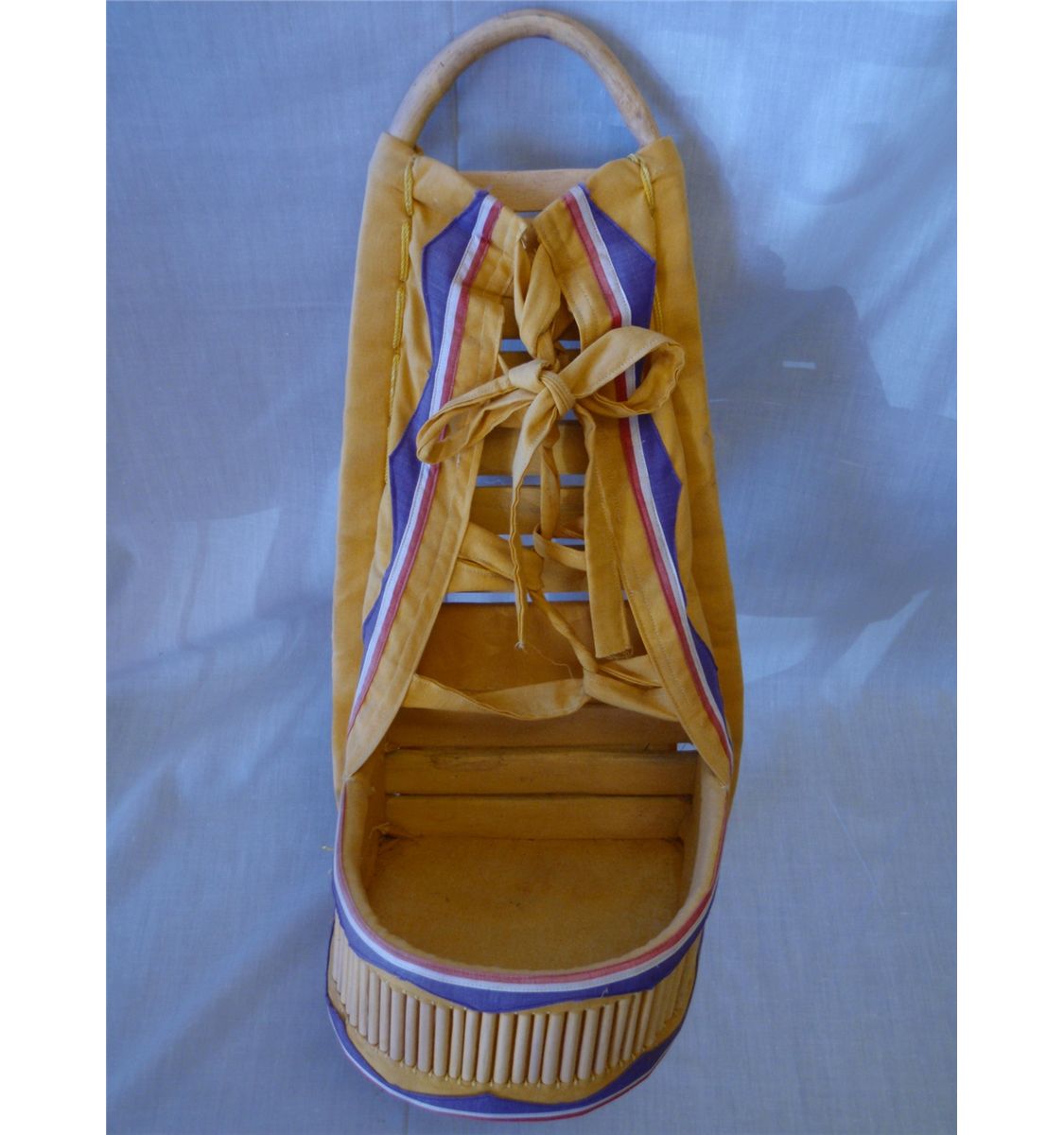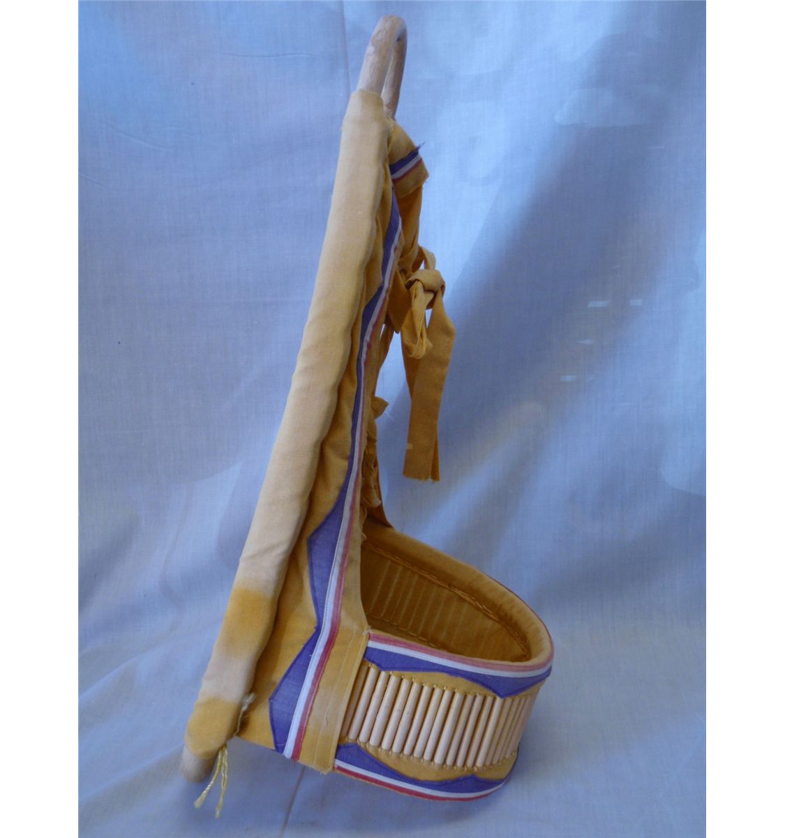 Ca. 1960's Child's Cradle Board. Canvas with applied material on wood. The Photos are obviously upsidedown as the parts that sticks out is meant as a shade for the baby's head not as a seat. Measures:20 1/2" Tall x 9" Wide x 9" Deep. Shipping on this lot: $20.00. Additional Shipping Charges for Lots sent outside of the U.S