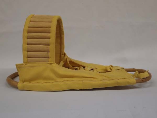 Apache Cradleboard. Made from Ocotilla Cactus, Canvas and Cactus root Dye. Cradleboards are used for the first few months of an infant's life, when a portable carrier for the baby is a necessity. This 19''H x 8'' W cradleboard is ready for ornaments and sacred amulets often attached to the headpiece as well, for example ''beaded umbilical cord cases, and dream catchers or medicine wheels'', to amuse and help the infant develop his or her eyesight!