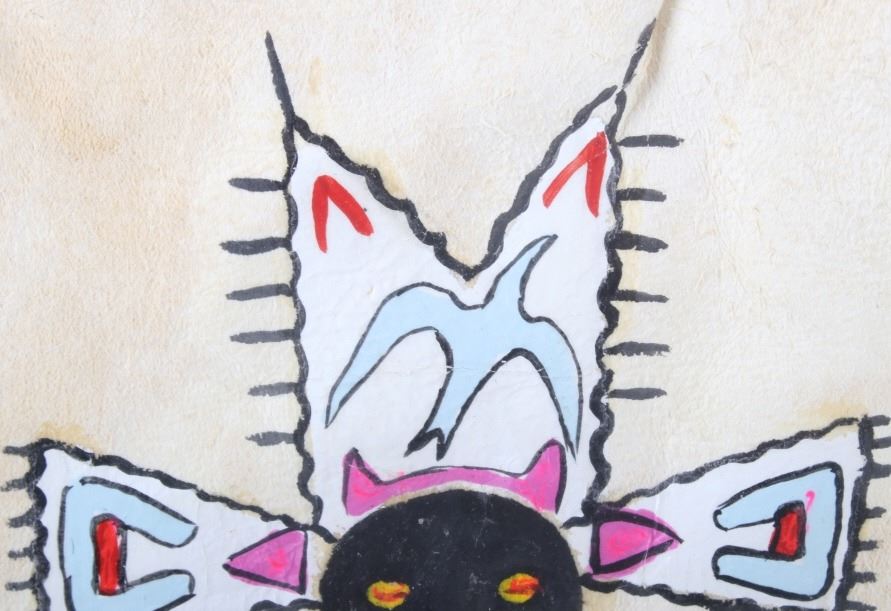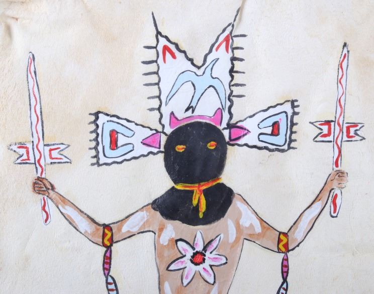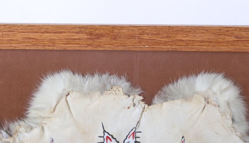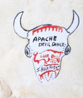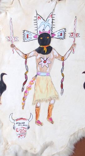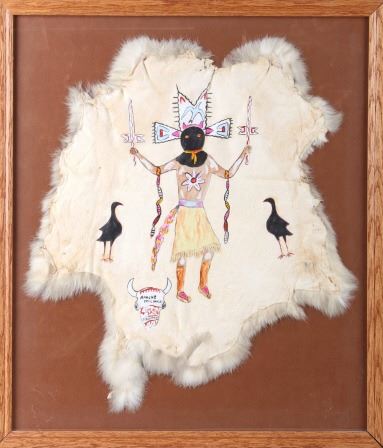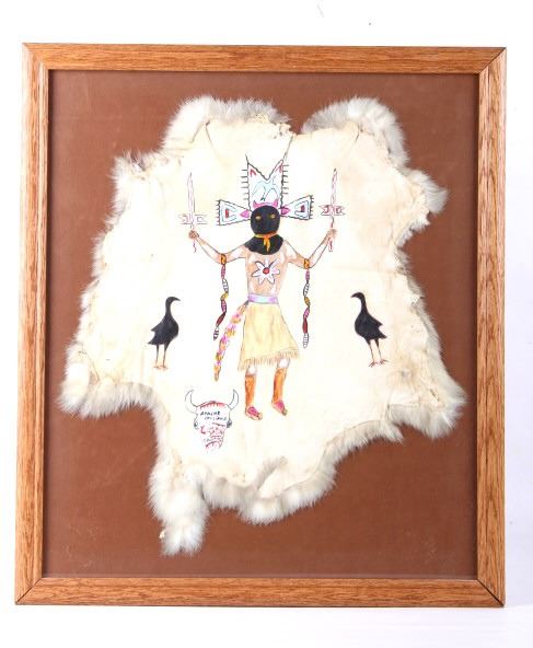 Featured in this lot is 1975 painting on rabbit hide entitled "Apache Devil Dance" by Stanley Harrison. The painting depicts an Indian dancer in ceremonial garb, along with a buffalo skull and two crows. The painting is in good condition and, with frame, measures 23.5" x 20.5".