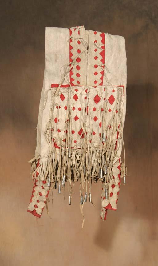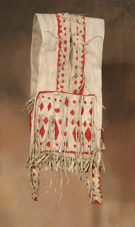Apache Dog-Size Saddlebags. 38" x 8 ½". Hide with red trade cloth cut out designs, adorned with tin cones. Late to early 19th century. RARE!. (est $2,000-3,000). For condition reports please visit: www.auctioninsantafe.com/cr2011.pdf
