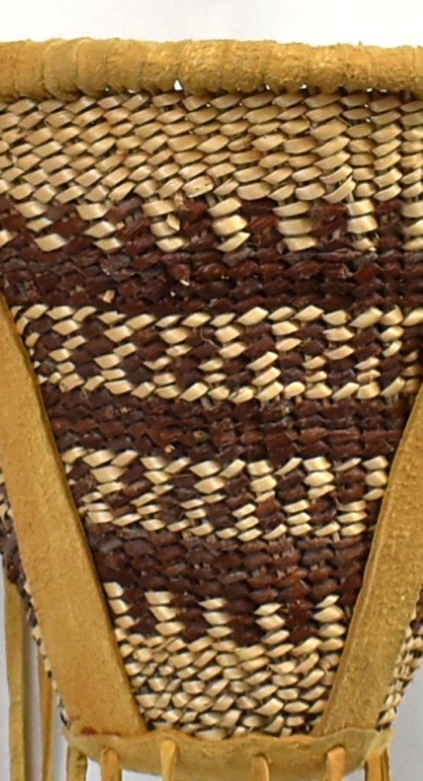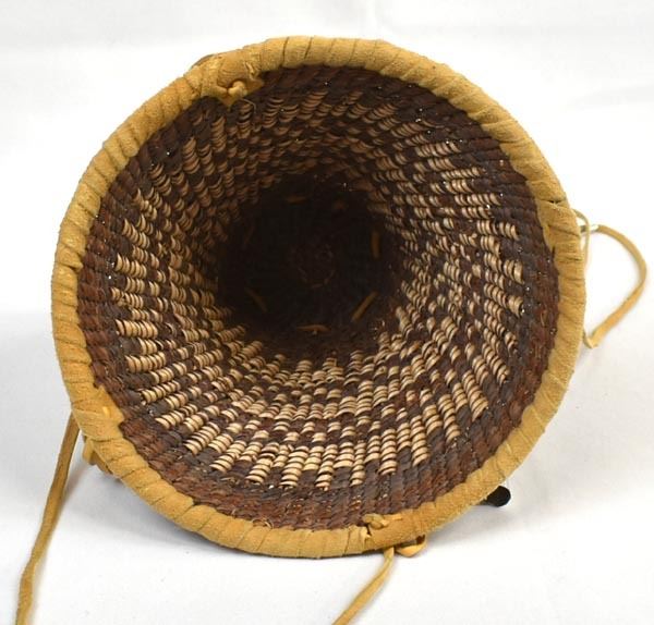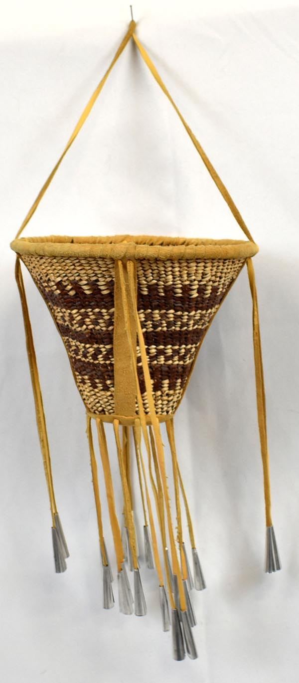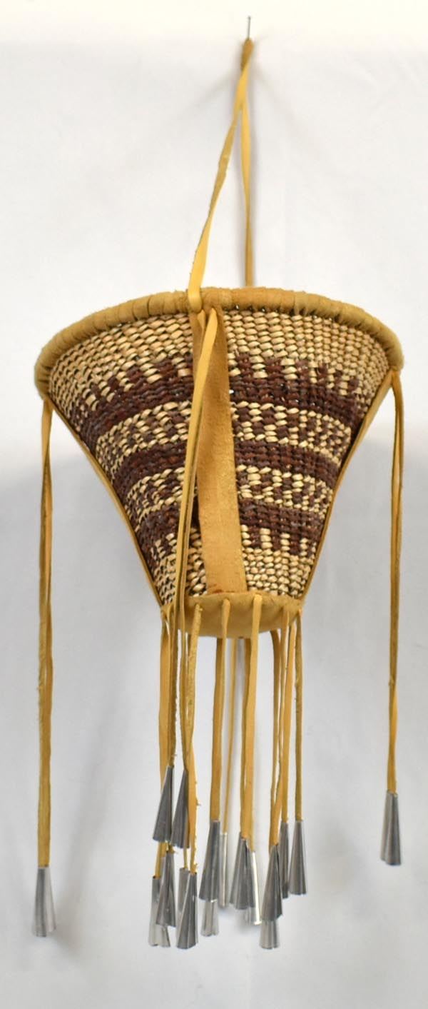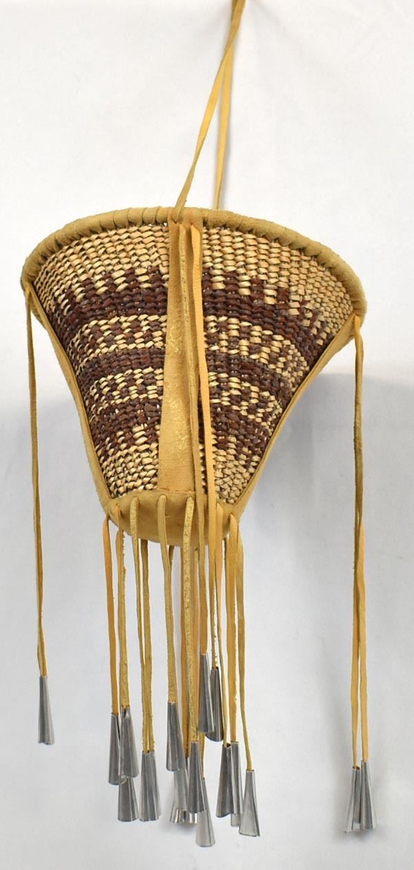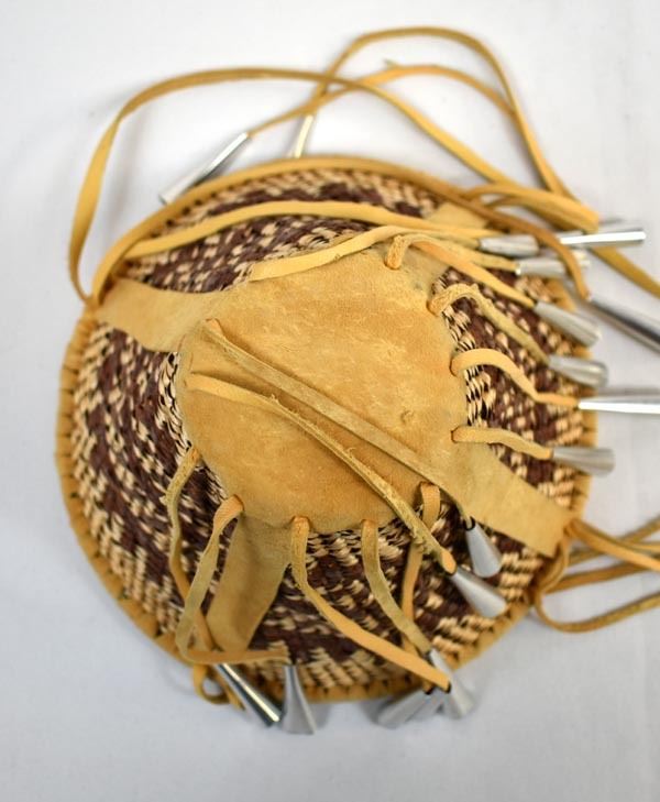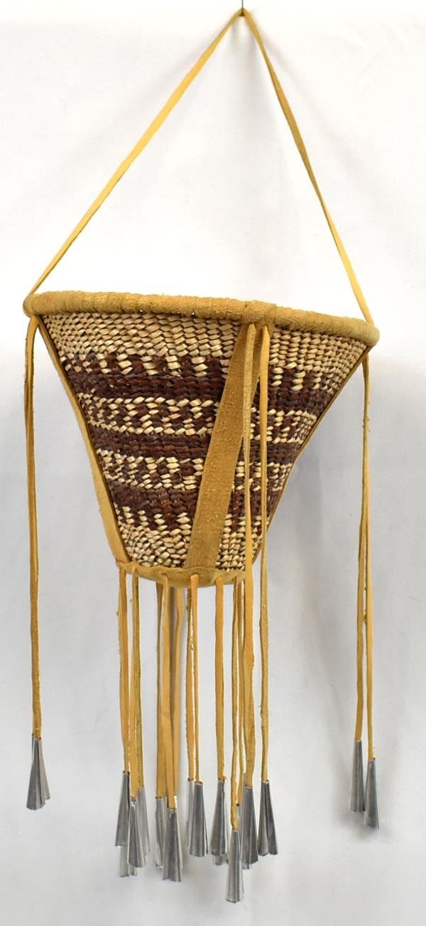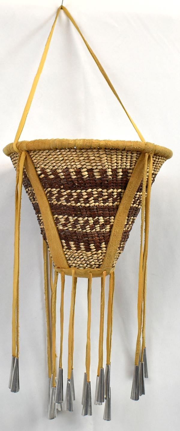 Native American Apache Double Weave Burden Basket, positive in and negative out, measures 8'' x 9'' which does not include the fringe, embellished with leather fringe and large tin jingles