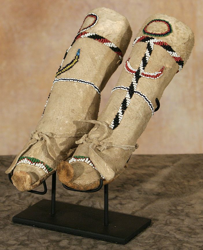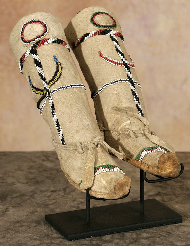 Apache Girl's Boots. 5 ½" long & 7" tall. Typical mismatched beaded designs in four colors. Hard soles with turned-up toes. Includes custom stand. Circa 1890. (est. $2,000-3,000). CONDITION REPORTS: www.auctioninsantafe.com/docs/cr2012.pdf