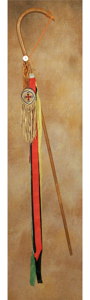 Apache Girl's Puberty Ceremony Cane. 40" tall wood cane. Decorated with twisted hide, ribbons, a mother of pearl button and a beaded pouch. Early 20th century. Provenance: Collection of Dr. Delwin and Karen Bokelman, PA.