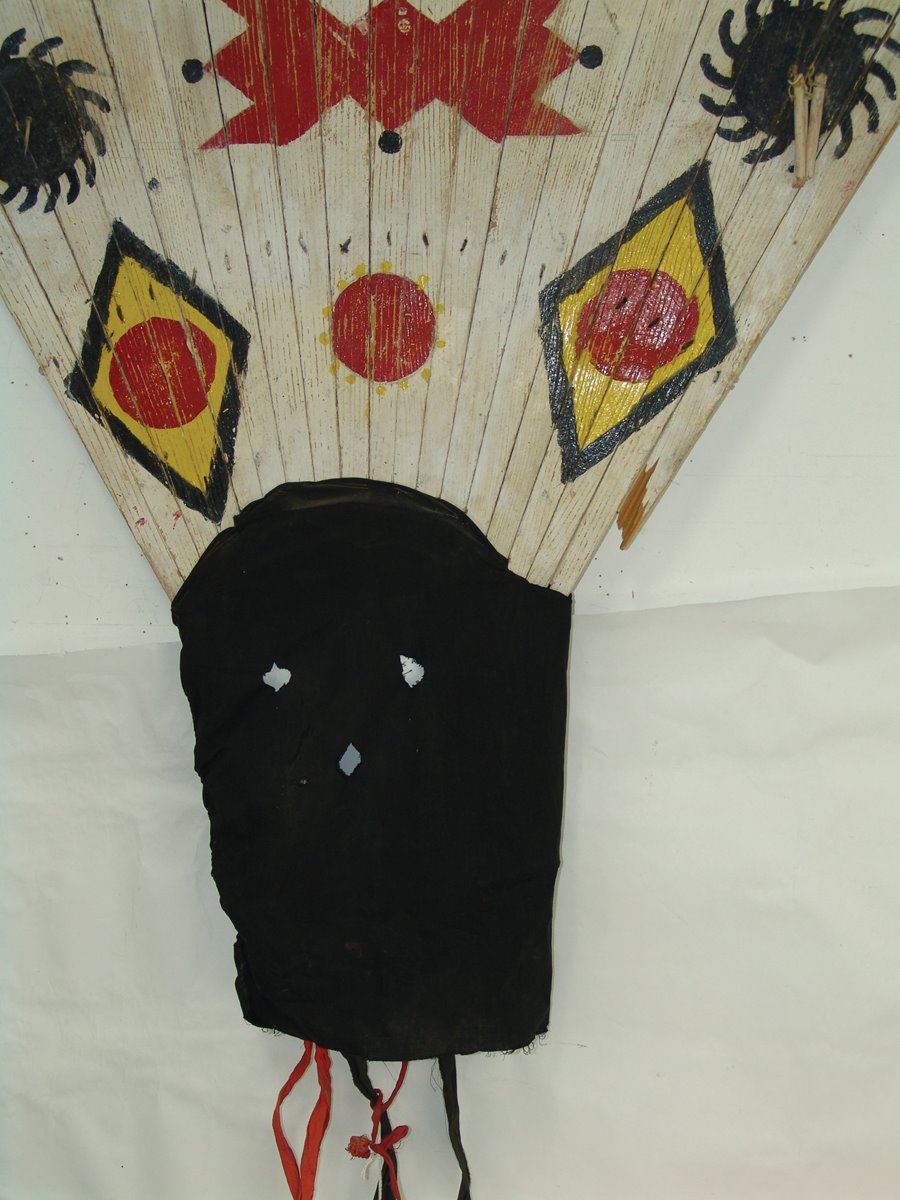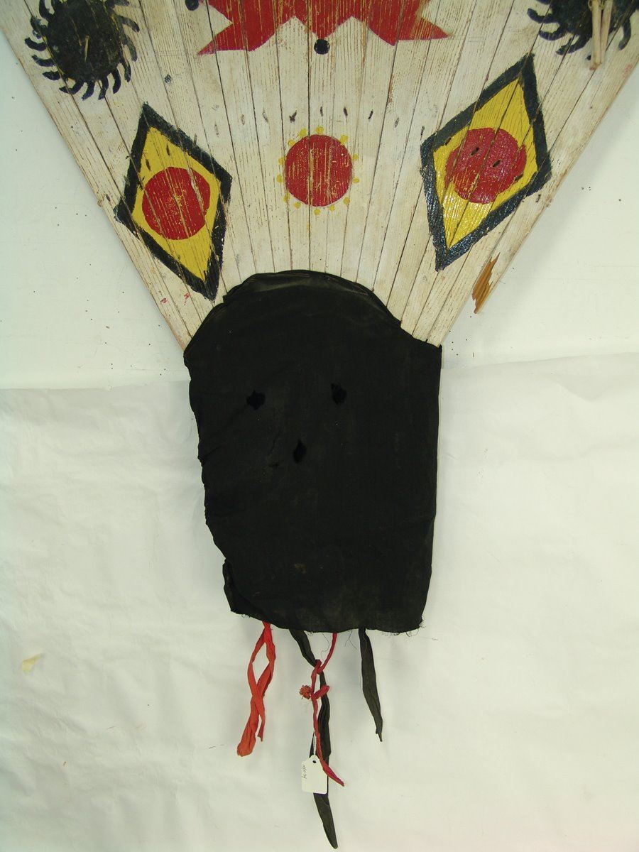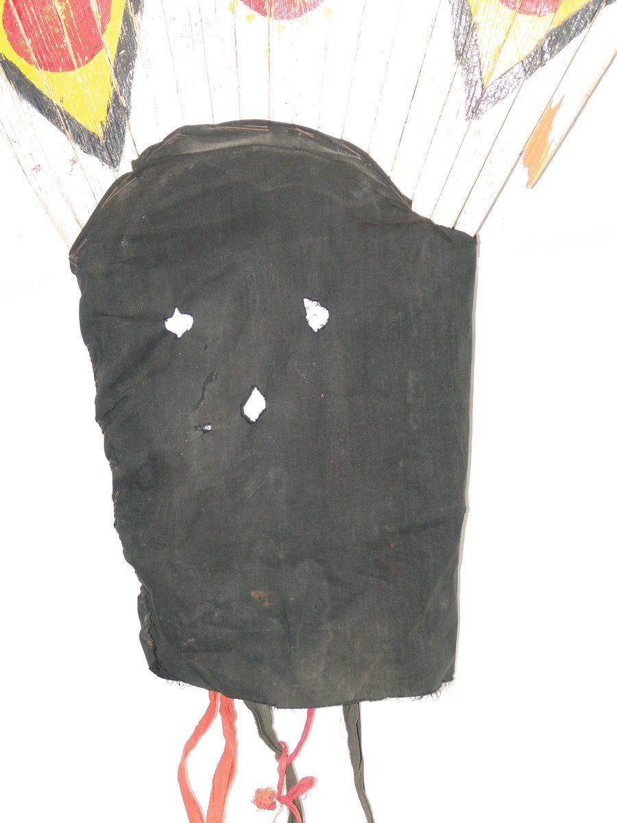 Early traditional hand carved and painted wooden Gaan /Crown Dancer's headdress with interesting, colorful symbols and with black cloth hood. Very good condition.,Early/Mid 1900s,33" x 29"